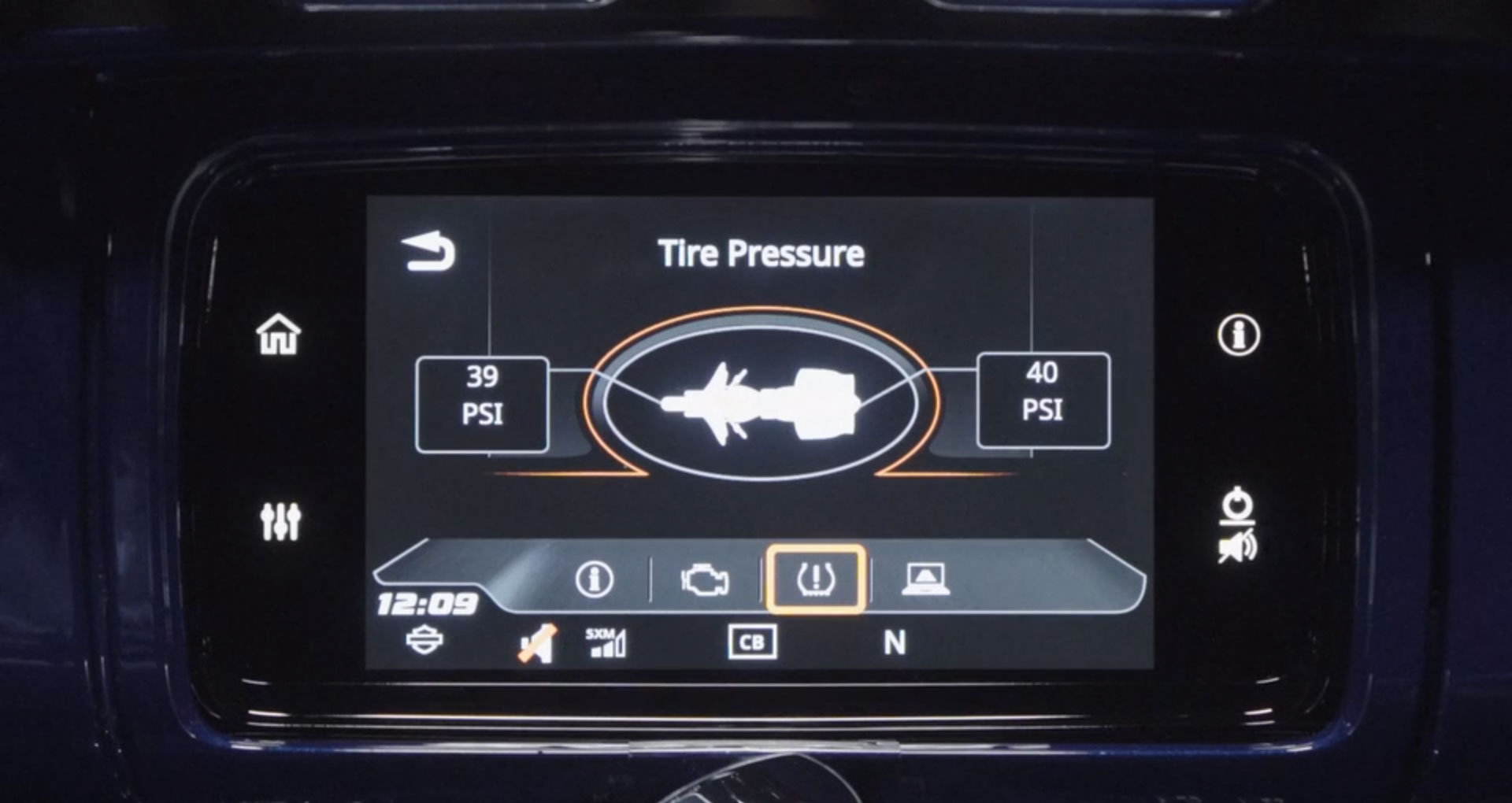 The TPMS displays current front and rear tire pressure on the Boom! Box GTS screen (or on the odometer on Road King models) and displays an indicator to alert the rider when tire pressure is low, and the pressure should be checked.