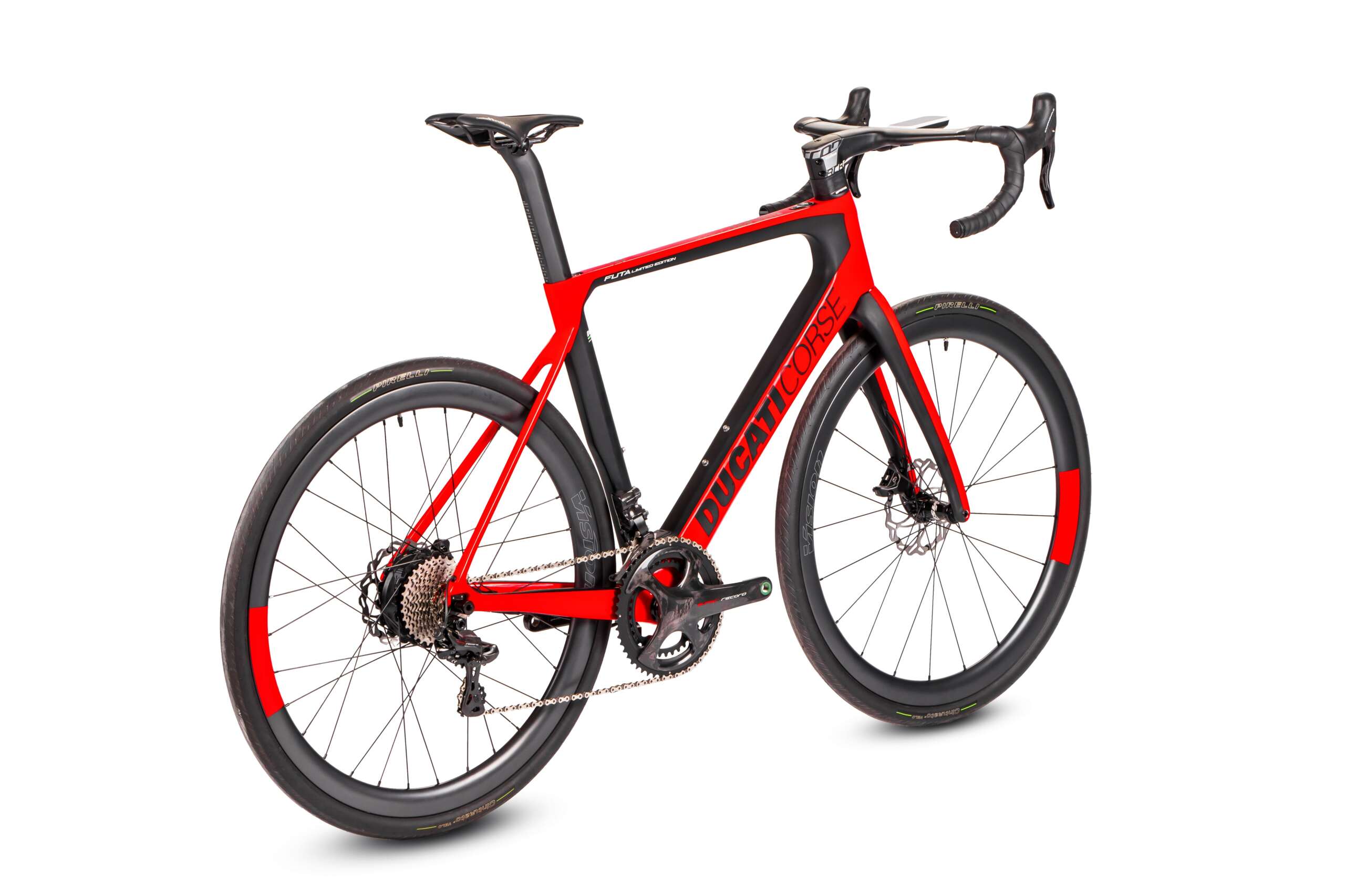 The Futa Limited Edition has an exclusive livery inspired by Ducati Corse racing universe. This special model maintains the features of the Futa, but integrates them with top-of-the-range components to offer maximum riding comfort and top performance in any situation. Standing out among these components are the Campagnolo Super Record EPS electromechanical groupset, a benchmark model in terms of performance built with quality materials such as carbon, titanium and ceramic bearings, the Vision Metron 40 SL wheels with carbon rims, at the top for weight-aerodynamics ratio and the highly aerodynamic Vision Metron carbon fibre handlebar with integrated stem and cables.