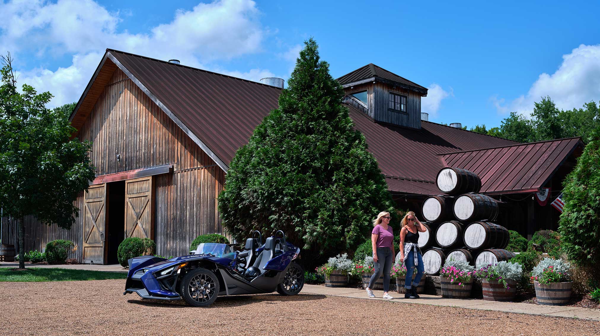 - Comfort: For added comfort and sun protection, drivers can choose to add an Excursion Top to their ride and further customize their Slingshot by selecting one of three canvas color options. The Excursion Top Canvas is available with black, gray, or red Slingshot branding to match or contrast with the Slingshot’s overall design. Drivers can also choose a Slingshade to stay protected from the elements without sacrificing style. The Slingshade features vertical opening T-Top panels with friction hinge technology and superior fit and finish. Designed to seamlessly integrate, it boasts sleek lines and automotive-grade finishes, perfectly color-matched to your Slingshot or customizable with more than 30 colors to pick from.