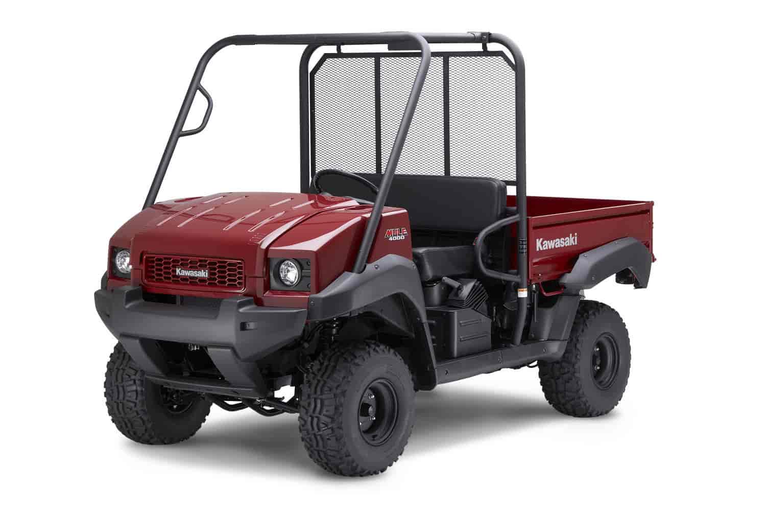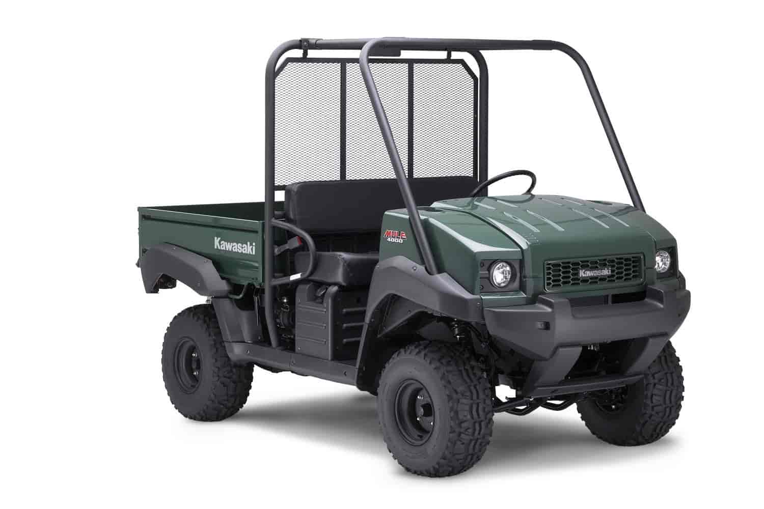 The Mule 4000 utility vehicle can carry 800 pounds in its steel cargo bed and tow up to 1,200 pounds when equipped with the optional draw bar. Other popular accessories include an enclosed cab, cab heater, snow plow, and soft or hard tops. These and many other Authentic Kawasaki Accessories are available through Kawasaki dealers.