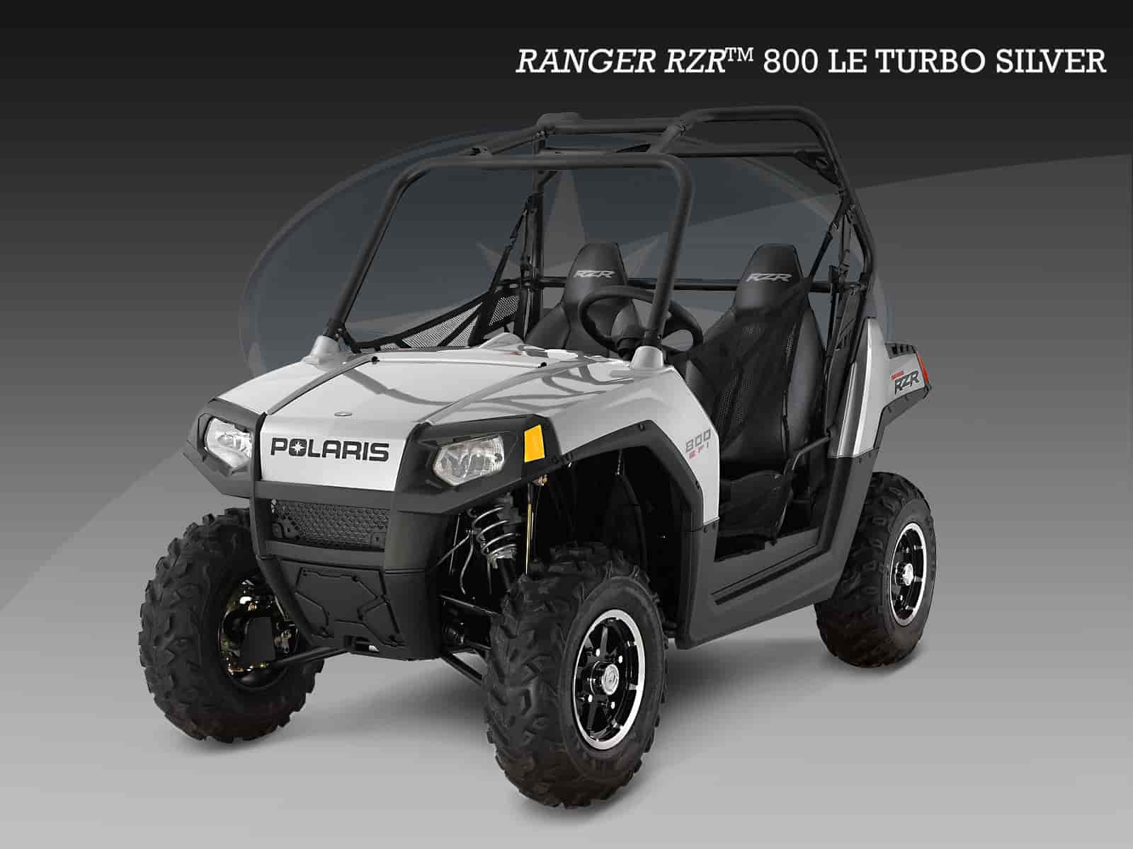 The 2010 Polaris RANGER RZR®-Turbo Silver LE Side-By-Side Vehicle with its narrow 50 in. width, is the only trail capable Side-By-Side Vehicle available today. This powerful vehicle dominates the competition with its agile patented low-center of gravity design and unbelievable 60 MPH (96.6 KPH) top speed. Its key RAZOR Sharp Performance® features include: