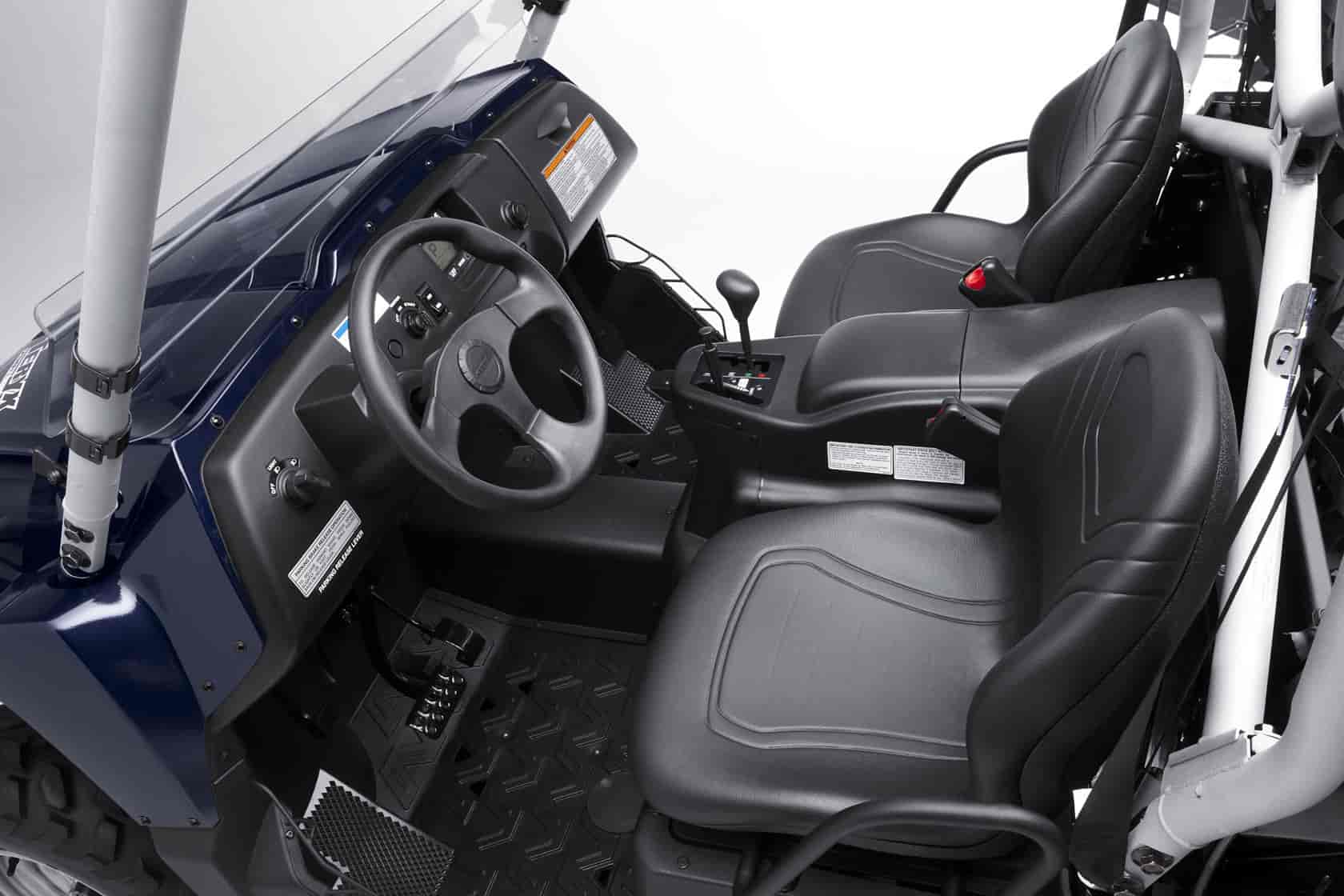 All that electronically enhanced performance is packaged in an advanced chassis narrow enough to navigate most trails (and fit in a standard pickup bed), yet wide enough to offer a roomy cab and a great ride. The wide-track design frame uses large-diameter, thin-walled tubing to combine tremendous rigidity with light weight. And the upper frame combines cool style and protection with enough room inside to fit two full-sized adults in a comfortable but supportive pair of bucket seats with retractable three-point seat belts.