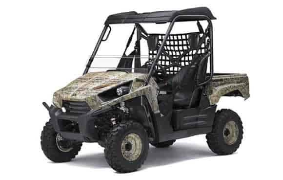Once comfortably buckled in, the rider can choose 2WD or 4WD with the flip of a switch, and Kawasaki’s super-efficient continuously variable transmission takes it from there, taking you practically anywhere you feel like going. A cockpit-adjustable variable front differential control even lets you fine-tune front-end traction. And while you’re doing all that, the Camo’s half windshield and cab top shield you from the elements, while its retractable cup holders make it easy to grab a refreshing drink on the go.
