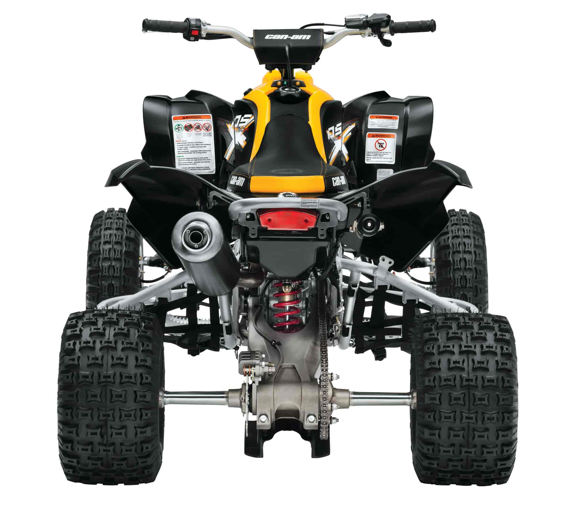 The Can-Am DS 450 comes out of the box ready to race with shocks, tires, wheels and more designed to get you out in front of the pack. Setting new standards for the industry, it features the first no-weld, all-aluminum frame, hollow rear axle and inverted brake callipers. It’s a sport quad ready to race with less unsprung weight, more mass centralization and, as you’ve come to expect from Can-Am, a better power-to-weight ratio. You demand performance from a sport quad. We invite you to ride it and tell us how we did.