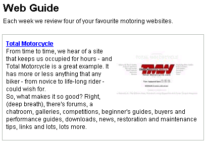 February 20th, 2004: Thanks to the United Kingdom’s Bike Trader for featuring us in their magazine. We thank them very much for taking notice of our (Total Motorcycle) growing website and for the line “It has more or less anything that any biker – from novice to life-ling rider – could wish for”… Many thanks from all of us at TMW!