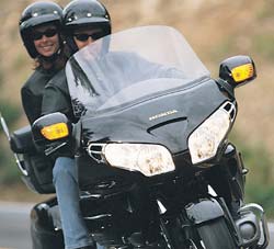 The GL1800 was finally announced for the 2001 model year. The official unveiling had been done the previous August and in an age where people could hide small cameras the size of a button on their person, it’s a miracle how Honda managed to keep pictures of the new Goldwing a secret for so long. Honda should really be put in charge of national security in Japan! They managed to keep a lid on things right up to the last minute. Honda had managed once again to completely redesign the Goldwing from the ground up. Everyone and his dog knew that Honda couldn’t simply continue to make their flagship tourer heavier as the engine size got bigger. Over the previous thirteen years, most magazine test riders agreed that the GL1500 had been pushing the limits of what they called the “performance envelope” and common sense suggested to Goldwing riders that if the next Goldwing couldn’t at the very least maintain the weight of the GL1500, then the end of the line had already been reached. With this in mind, Honda built an all new alloy frame which comprised only 31 parts, compared to the previous models 130. The new frame was much stiffer than before and combined with an engine both bigger at 1832cc’s and 4lbs lighter than before, this meant that the GL1800 weighed 40lbs less than the GL1500. The whole look of the GL1800 had changed from big comfy tourer to a more sporty long distance machine designed to appeal to the younger rider as well as existing Goldwing owners. Big news also was the inclusion of fuel injection and the option of ABS brakes, long overdue on the six cylinder monster. Slightly slimmer bodywork dragged the design into the new Millennium, yet Honda had managed to make the seat much bigger and there was more pillion space. The seat height and diameter of the wheels remained the same as before, but the tyres were wider and for the first time on a Goldwing they were not supplied by Dunlop, but Bridgestone. Honda’s efforts resulted in a machine that went and stopped far better than most people had dared to hope and riding it gave the impression that it was far lighter than the GL1500, rather than a mere 40lbs. Magazine test riders all over the world heaped praise on the new Goldwing and it was no longer a machine for Goldwing bashers to ridicule. The general consensus was that the GL1800 was much more practical than before and was a motorcycle that many riders would use every day, rather than saving for use at weekends. The Hondaline department, now very slick and efficient, were not caught napping this time. The marketing of accessories was helped by wide use of the Internet, as well as brochures and magazine adverts. There was a staggering 51 items available from Hondaline for the GL1800, far surpassing any effort made for previous Goldwings. Indeed, it was now possible for a Goldwing to become a bottomless pit for those who had the cash to spend on Hondaline accessories and the aftermarket suppliers had to take a deep breath and look very hard to find spots to fill this time and over the coming months there was a drip feed of items made available, rather than the usual flood. 2002 saw no major changes. The GL1800 was too new to do more than tweak here and there. Three new colours were introduced and the Goldwing was still available with or without ABS brakes. The full Hondaline range of accessories was still available and the aftermarket to their credit had managed to add many more bits and pieces to their product ranges. The high price of the Hondaline stuff no doubt gave lots of scope for the competition. A recall during the previous year saw the pulse rotor being replaced on many models and the kill switch on lots of models had to be fixed too, so Honda seem to be on top of things. 2003 is here and the GL1800 continues to be improved on. No major model or name changes, the ever popular Candy Red makes a welcome return for this year. The early CD player problems appear to have been fixed and the Bridgestone tyres that cupped and wore out at worryingly low mileages have been replaced by Dunlops. For some reason, the windshield now has two sliding bolts instead of four. The rumour mill has started to grind into action again, with reports of a possible Aspencade and SE addition in a year or two. A huge range of aftermarket accessories is now available for the GL1800, alas at the expense of the GL1500 and older models. Every year sees available accessories for older Goldwings sink without a trace. – Steve Saunders Goldwing Page
