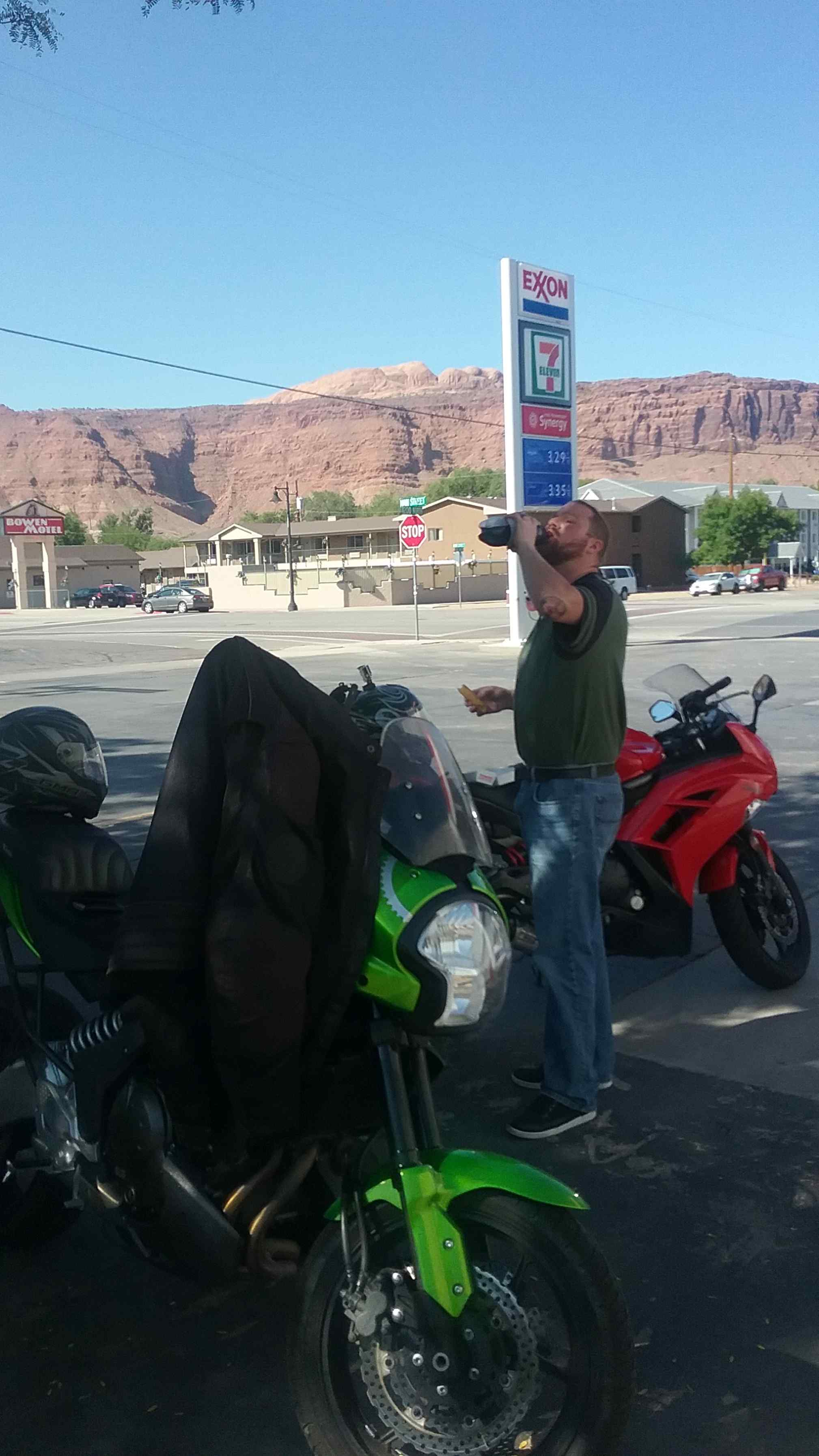 Save old plastic containers or purchase bottled water and keep a couple with you. Hydrate and refill at stops. It’s always a good idea to travel with bottled water anytime you ride.