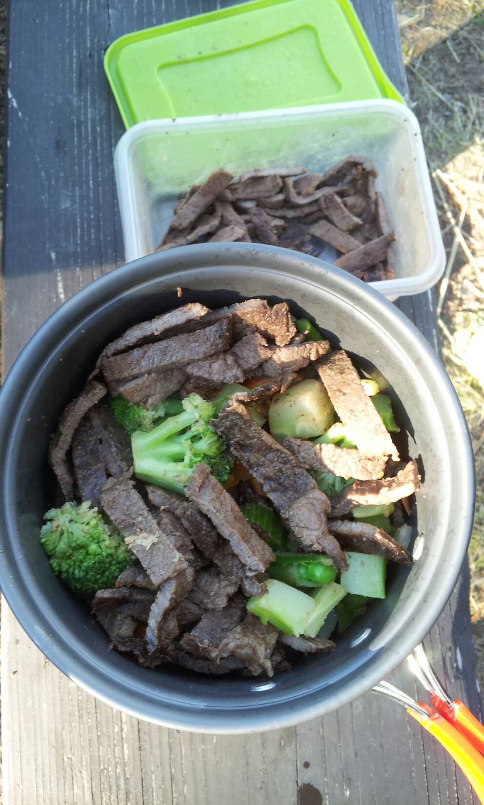 If you’d rather have some home cooking after a long day on the road you can always make a run to the local grocery store after you set up camp and pick up a few things. Eric makes a mean garlic beef and broccolli stir fry in our little butane camp kit. Spend $7 for a package of thinly sliced sirloin, $3 for a tiny jar of crushed garlic and a steamer bag or 2 of broccoli or your choice of veggie for less than $2 a piece. That’s less than $20 for dinner for two.