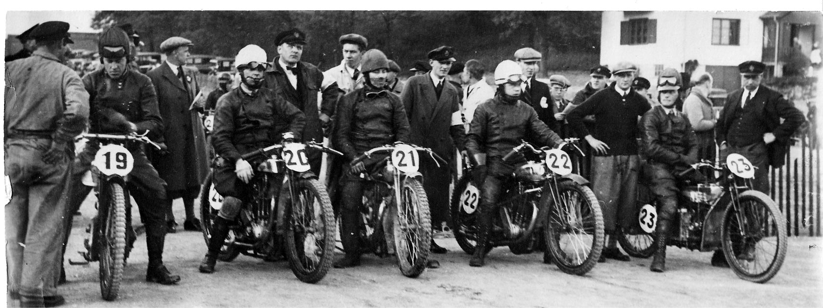 Sunday – race day. Bright sunshine – excited motoring people. Shell provided a petrol tank hanging high in order to give a maximum fill rate during the shortest possible time. That’s how the tank was filled in the pit area in older days. You had to stop at the exact place and moment; too long and you were asked to do a new lap since, in the 1930s, backing the machine in the pits was strictly forbidden. So, 35 eager men were lined up for the start in the three classes A, B, and C, consisting of 250s, 350s, and 500 cc machines respectively. Time moved slowly… three minutes to go… an eternity… push the bike backwards… flood the carburettor… then, finally, the flag drops and all riders push… take some steps forwards… hop on their machines, all hoping the engine will fire up as they should. The Finn Lampinen and Barthelsson are ahead, charging for the lead. People scream and wave the Swede ahead. Go for it, man! The spectators could move easily from one side of the track to follow another. This was appreciated, of course – you saw more of the competition. After 8 laps, Gunnar was three machine-lengths ahead of Lampinen – how long could this last, though? They had now been running a little over half an hour in this treacherous pace.