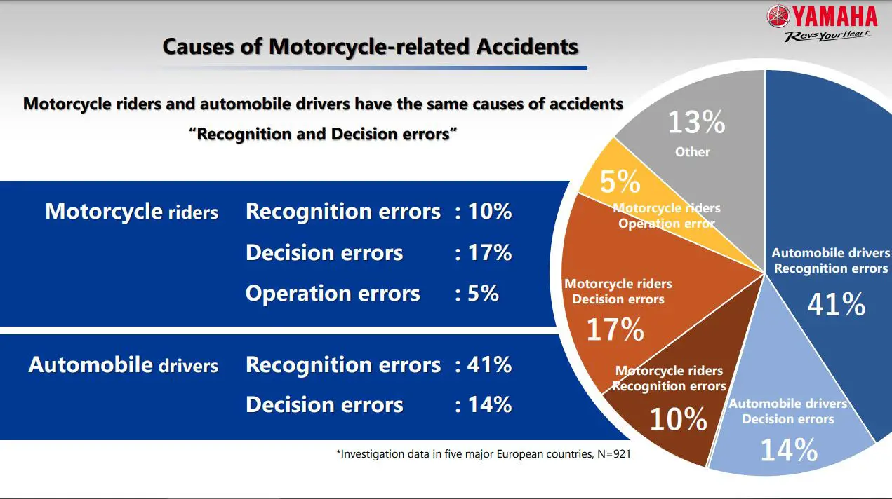 Some 30% of motorcycle accidents are caused by error or negligence on the part of the rider, but over 50% are due to car driver error or negligence. The first step we must take is to eliminate errors by riders in identifying potential dangers, making sound judgments, and skillfully operating the motorcycle to avoid said dangers.