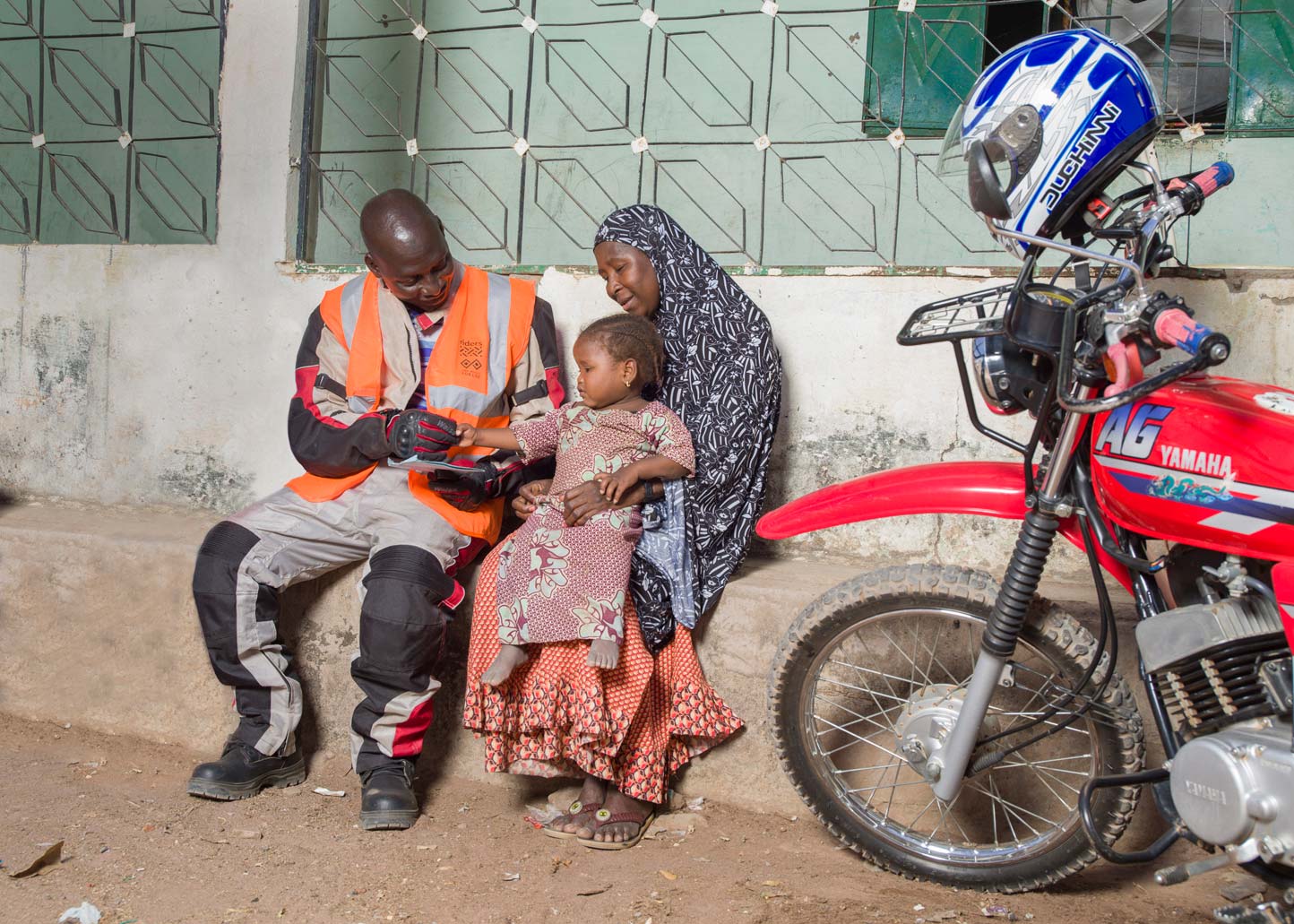 Community health workers with a motorcycle provided by Riders for Health can visit six times more people than they could on foot and having this transport doubles the amount of time they can spend in each village they visit.