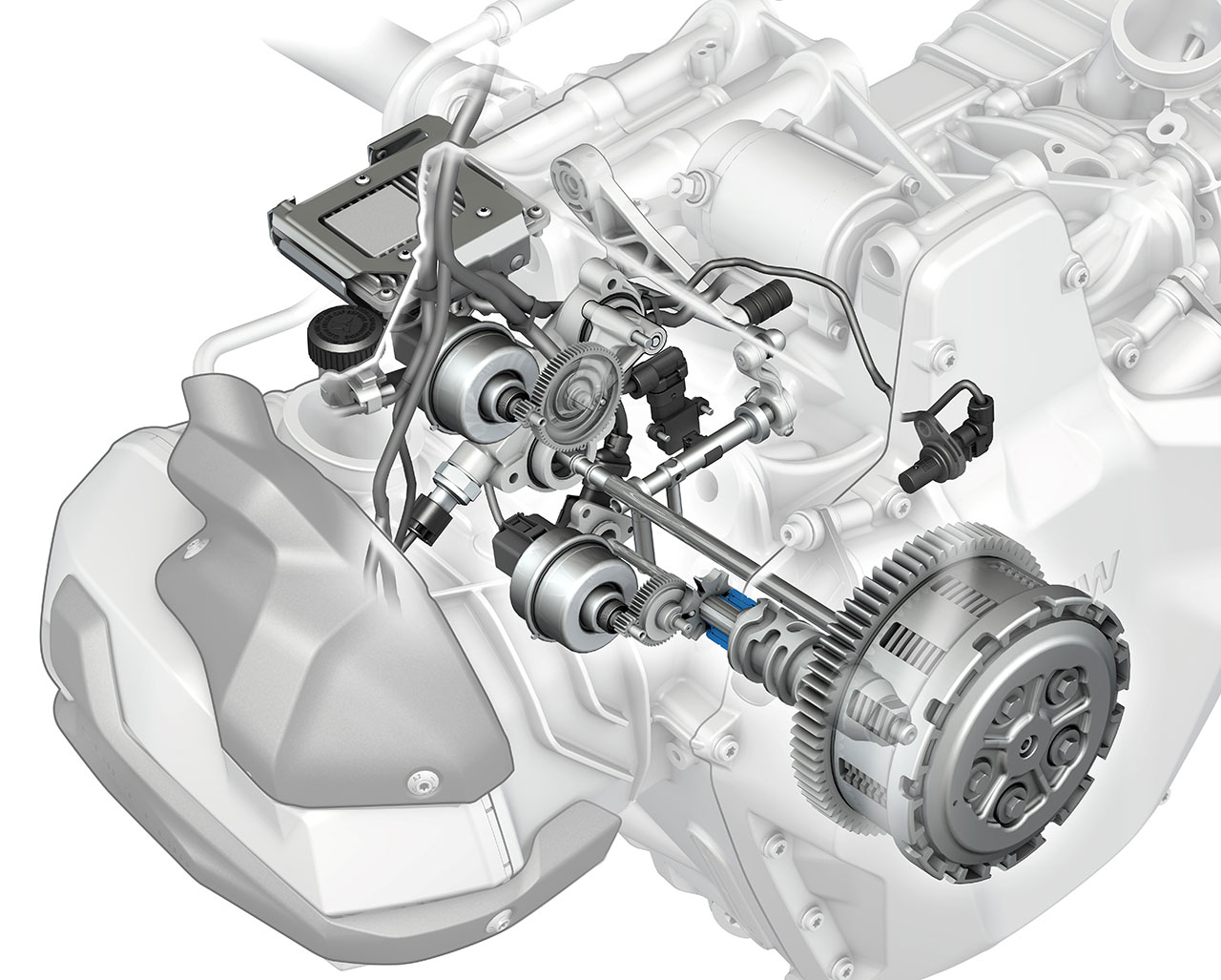 The Automated Shift Assistant is the logical and technical evolution of the BMW Motorrad Shift Assistant Pro. Two electronically controlled electromechanical actuators operate the clutch and gearshift, enabling easy starting and automated gear changes. The rider’s shift request is transmitted to the control unit via a gearshift lever sensor, which is actuated by the conventional foot-operated gearshift lever. Additional sensors determine the revs of the transmission input shaft and the clutch position. These values are transmitted to the TCU (Transmission Control Unit), which is closely linked to the engine control unit, for control of the clutch and shift actuation.