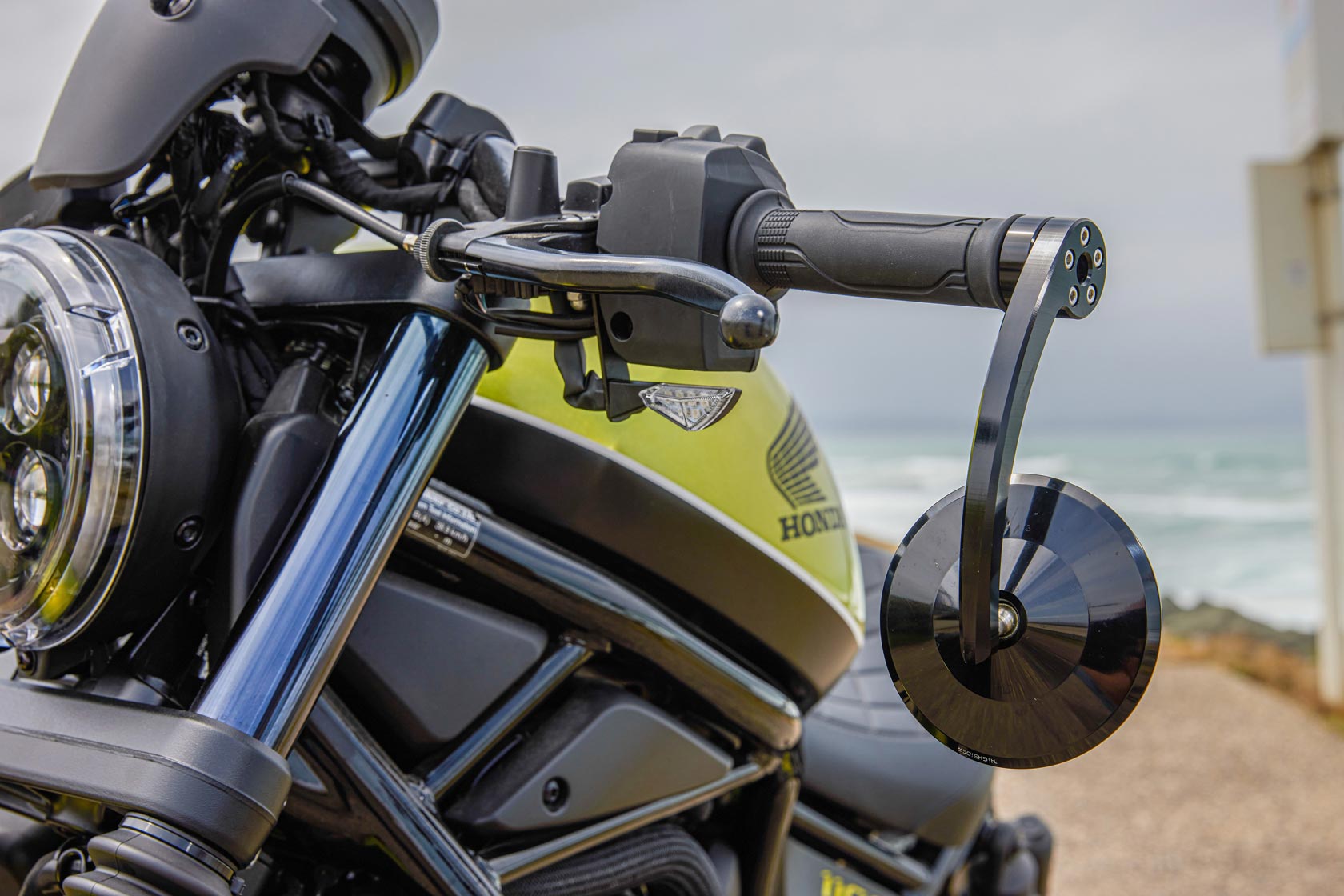 Building on the bobber vibe are aluminium handlebars, leather seat with perforated leather ribbing, simple aluminium front mudguard with Mirrachrome finish and painted headlight surround. Mini-Bates FCR Original LED indicators tuck neatly away and like the CMX Sport a 3D scan produced the custom polyester-carbon fuel tank – with Mirrachrome/blue satin finish – and aluminium filler. A ceramic-coated FCR Original exhaust is the finishing touch, highlighting the mechanical beauty of the bike.