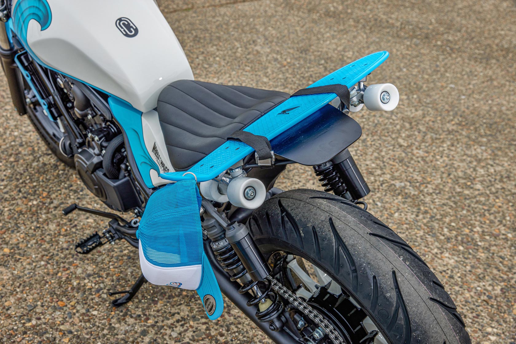 The third member of the ‘family’, FCR has revisited all the original lines of the CMX500 giving it a whole new purposeful identity. Taking their inspiration from the feeling of the Wheels and Waves festival and the Californian spirit, they have left the engine stock, but have made changes to the rear suspension, the bars, indicators, front mudguard, exhaust, tank and rear luggage rack. The whole bike is finished off with a blue and white paint scheme featuring a wave motif on the fuel tank’