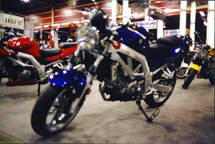 The biggest news was the release of the new Suzuki GS500F and Suzuki V-Strom 650 motorcycles for 2004. While the Suzuki GSX-R600 and Suzuki GSX-R750 received major upgrades. And the first big bike from the Kawasaki/Suzuki partnership, the 2004 Suzuki Marauder 1600 (Kawasaki Meanstreak) was also there at the show. One bike that was there surprised us, the Suzuki SV650 standard, since there was no rumor of it coming to Canada to be sold here in 2004.
