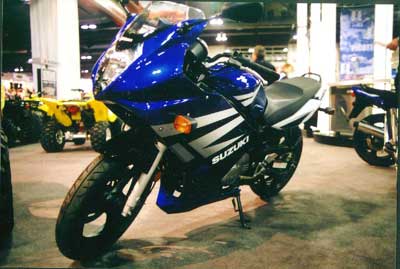 The newly upgraded 2004 Suzuki GSX-R600 was also at the show. Lighter, better-handling, stronger, it delivers the best power-to-weight ratio in its class. With performance features straight from our factory racing department, the newest GSX-R600 features titanium valves, inverted forks, and radial-mount brakes and master cylinder. Add to that an aggressive new aerodynamic package, a powerful new digital fuel-injection system and a state-of-the-art engine management system with even more power than before. The GSXR600 continues the winning line of 600 sportbikes from Suzuki.
