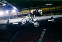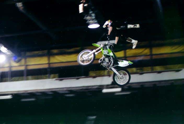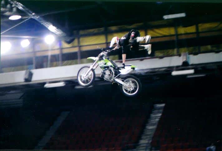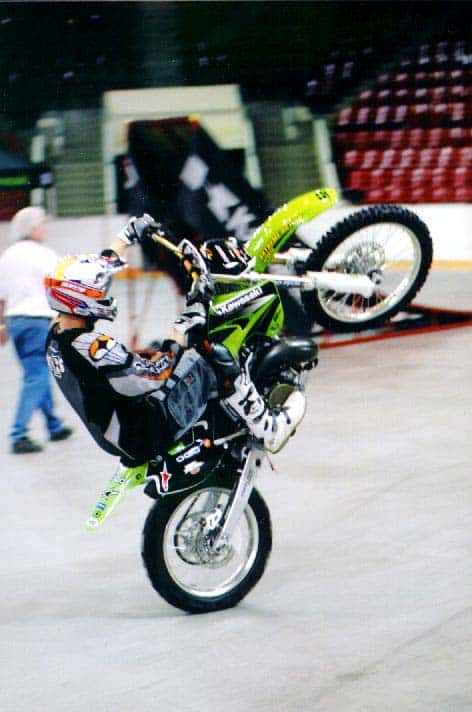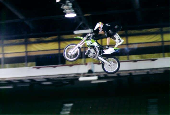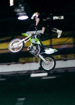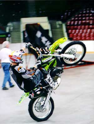 He has been riding motorcycles for 17 years, and was a motocross racer for four years before switching to freestyle in 2000. He currently travels North America doing demonstrations and competitions, and hopes to be a top name in the sport. He also hopes to master the back flip before retirement. “The back flip was insane a year ago,” he says. “The sport is young and growing at a ridiculous rate. Riders are pushing tricks further every year.”