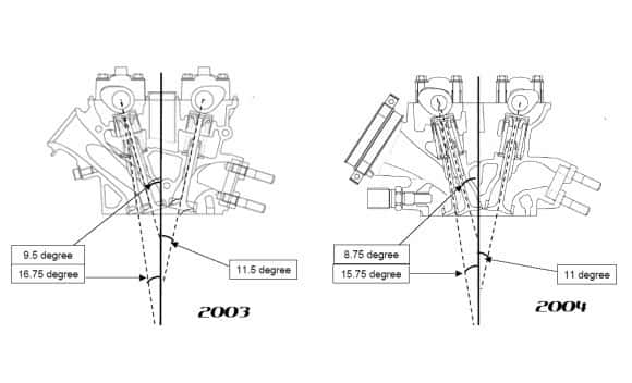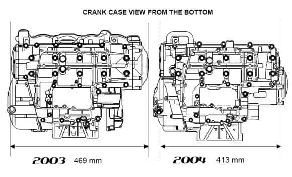 Because the new frame is much stronger, the new 40° slant block motor is no longer employed as a fully-stressed member, and the new cylinder is now separate from the upper crankcase, and not a unified design as seen on the ’03 model.