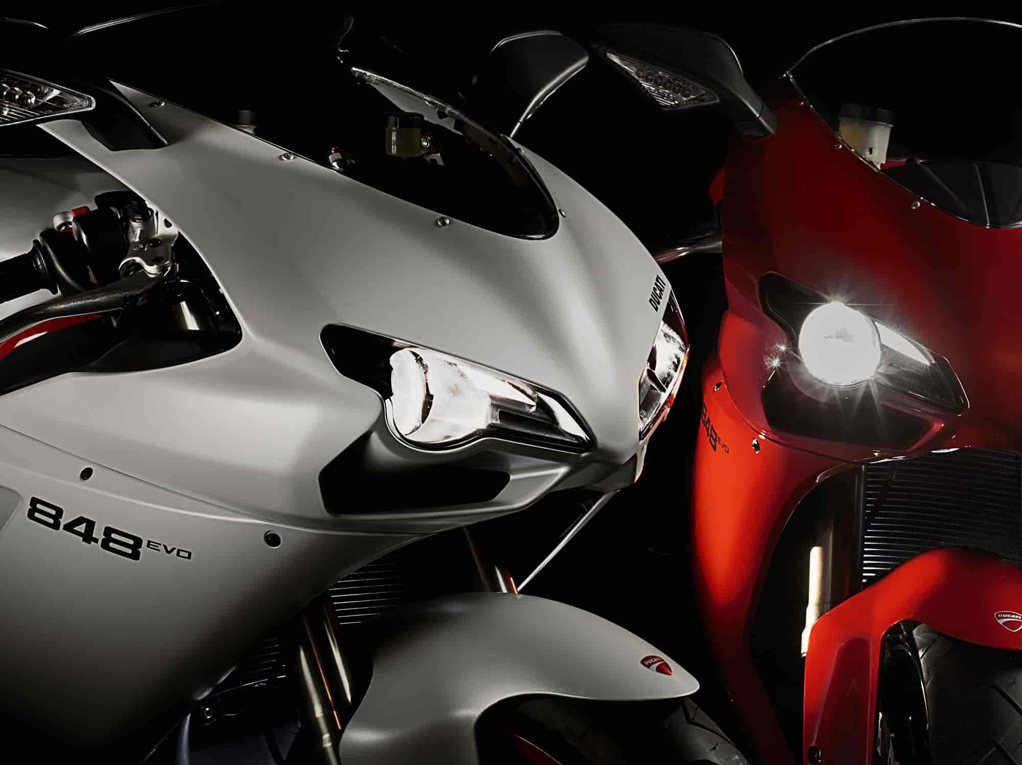 The 2012 848EVO maintains the traditional colours of Ducati red with red frame and black wheels, “dark stealth” with racing black frame and black wheels and arctic white with red frame and red wheels. New for 2012 is the 848EVO Corse Special Edition, specially dressed in red, white and black colour scheme with red frame and black wheels.