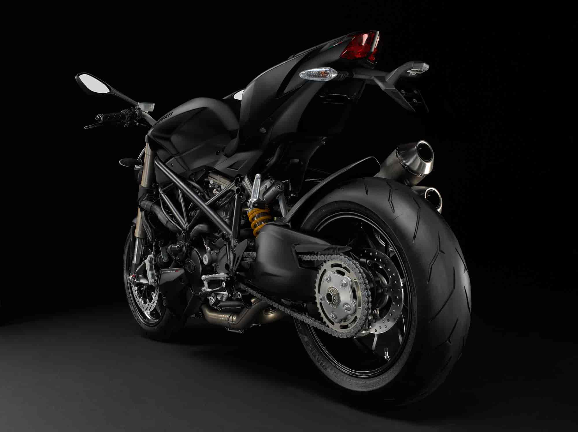 At a class-leading 167kg (368lb) dry weight, the Streetfighter S also comes to the fight with the highest power-to-weight ratio in its class. The purpose-built Trellis frame, which uses 25.6° of rake compared with the Superbike’s 24.5°, ensures a well-planted front-end, while a fully cast aluminium single-sided swingarm at the rear is new for 2012. The rake, longer wheelbase and cross-mounted steering damper ensure stability even under the extreme acceleration of Ducati’s incredible L-Twin torque.