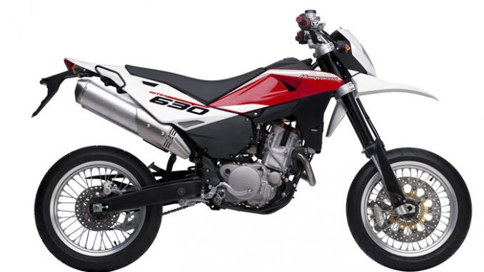 The SMR630 has a single cyclinder 600 cc engine. The DOHC head with a red painted cover is inherited from the Husqvarna competition bikes and this permits a 20% increase in power over the earlier 576 cc version. The SMR630 has an electronic fuel injection system developed in collaboration with Mikuni. The exhaust system on the four-stroke single cylinder engine has a “closed loop” lambda probe and twin aluminium exhaust silencers. The catalyser has been redesigned and optimised to meet Euro 3 requirements. The silencers are covered with stainless steel guards in the catalyser and passenger foot peg areas.