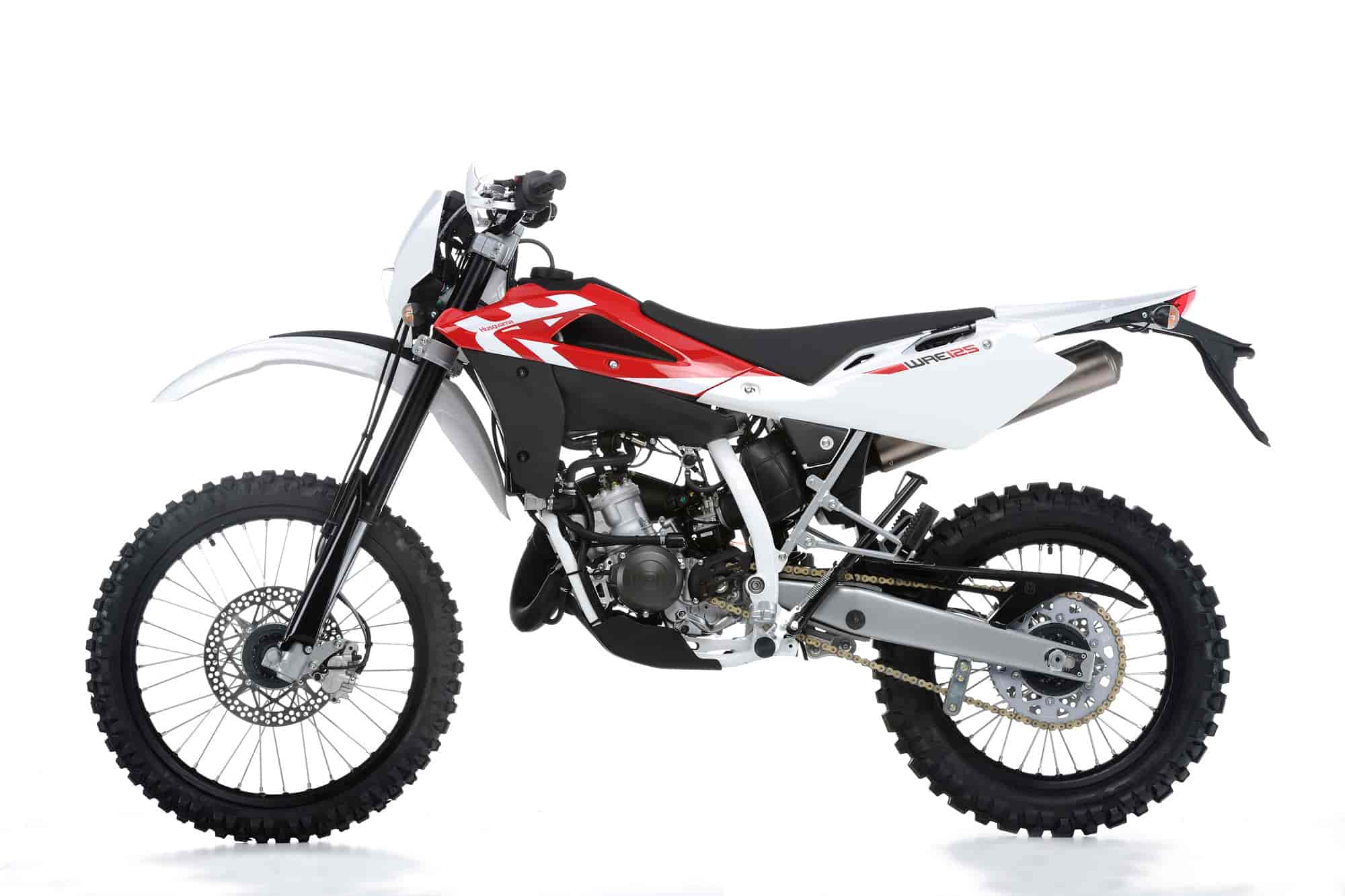The WRE125 has always been a key contender in the trail world, and recognised by the press as the perfect machine on which to begin off roading This year it has undergone a facelift and its graphic design now reflects the racing-based models with a new red and white colour scheme. The white chassis and anodised black hubs give the bike a look that is even tougher than before.