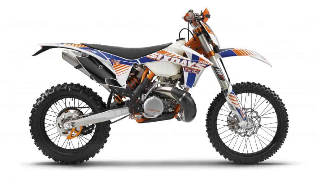 • The same design as the KTM factory bikes thanks to Six Days graphics, orange powder-coated frame, orange anodised triple clamps, orange anodised handlebars and anthracite anodised silencer