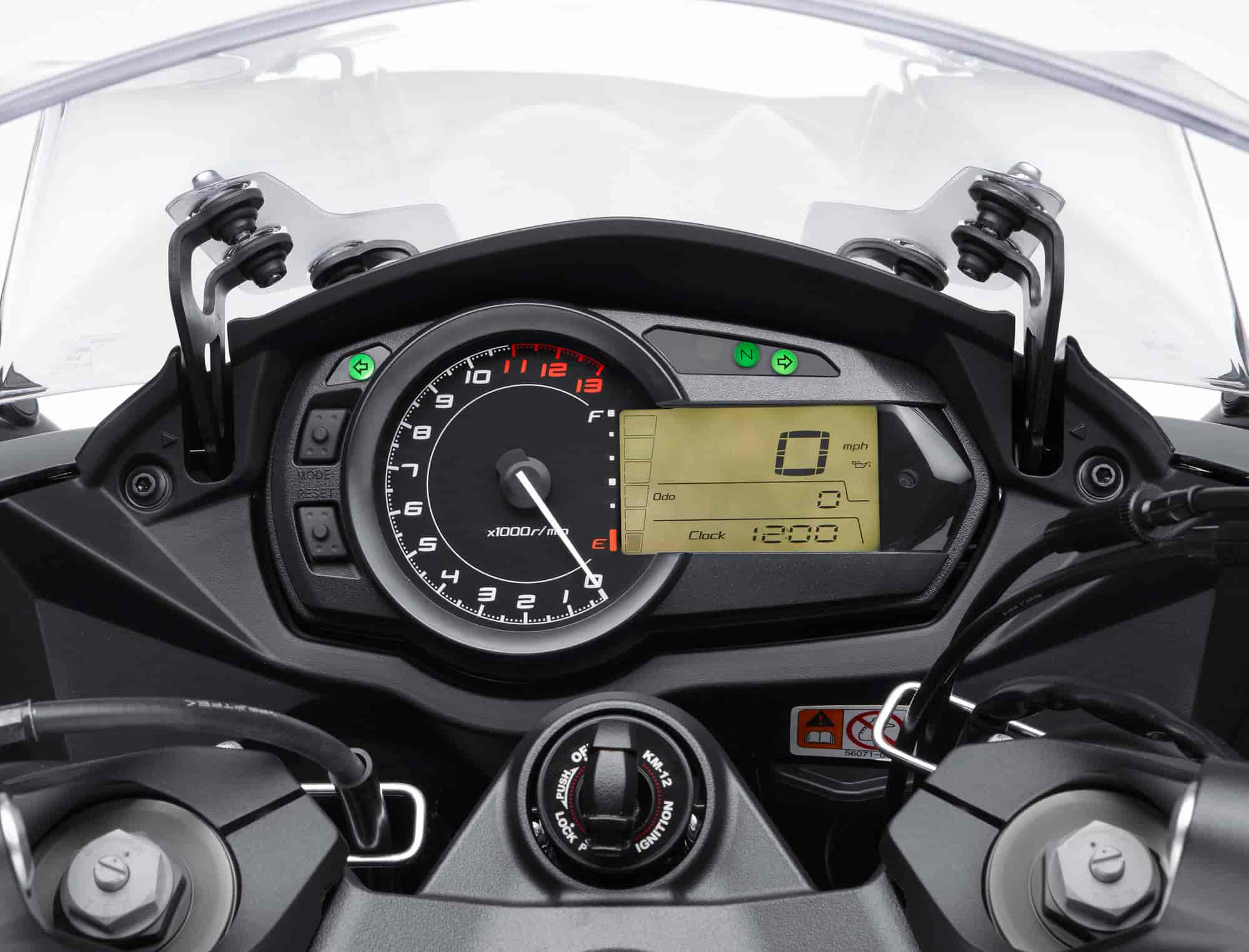• Sporty instrument panel features a large analog tachometer and multi-function LCD screen. It’s a design based on the ZX-6R’s unit, but which features original graphics and coloring