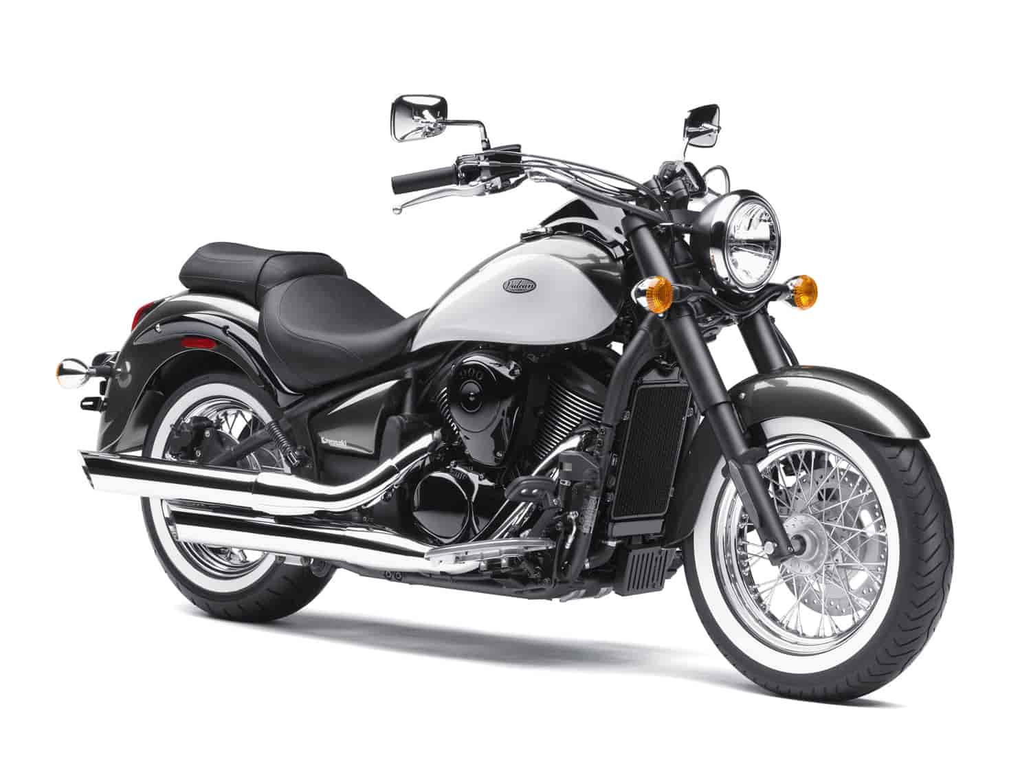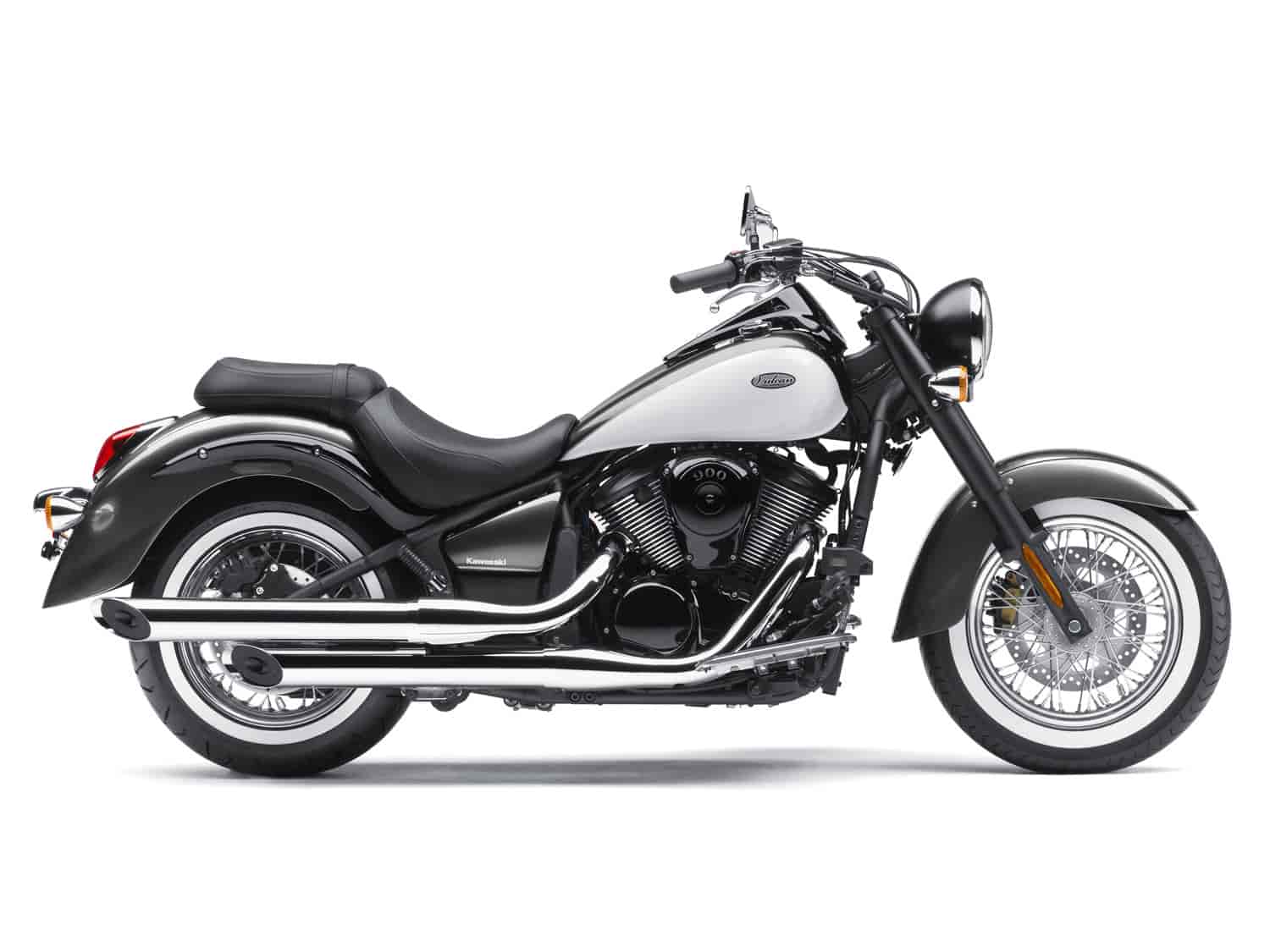 And for those looking for an even more distinctive look, the Vulcan 900 Classic Special Edition Special Edition exudes badass with a new for 2012 blackout treatment on the forks, fender struts, air cover, engine covers and cases and cylinders and valve covers. A beautiful Pearl Meteor Gray / Polar White paint job is enhanced by a checkered flag pinstripe. Completing the Special Edition look are chrome pipes and whitewall tires, for the ultimate in retro flair.