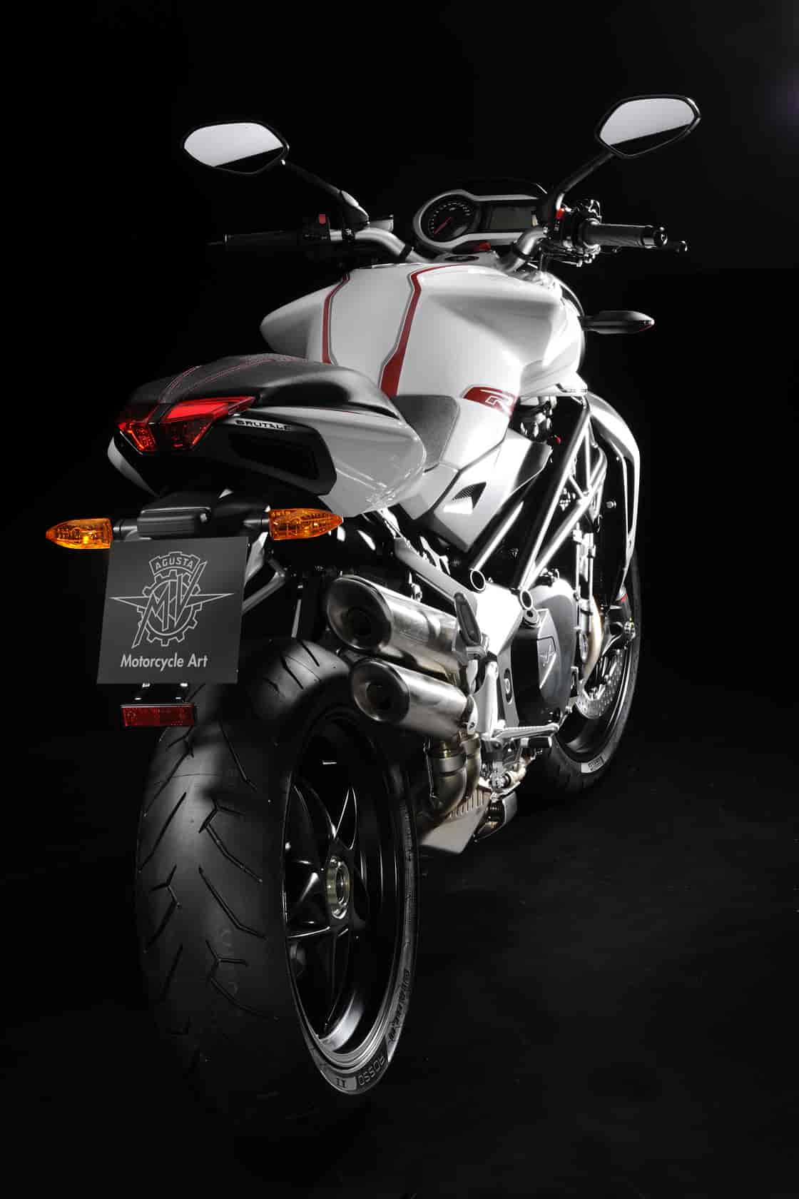 The two available color schemes are black and white. The single sided swingarm along with the unmistakable styling make this new BRUTALE unique. A masterpiece of Italian Design, the attention to detail and monochromatic color schemes helps to highlight the technical details like the over-under side mounted exhaust and the original MV Agusta frame design integrating tubular steel and aluminum side plates.