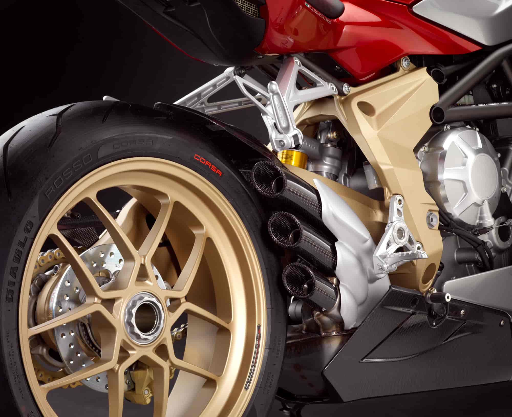 The F3s carbon fibre components add a unique richness to the bike. The front and rear mudguards, dashboard cover, airbox side and intake covers, fairing inserts, both upper and lower chain guards, swingarm protector cover, sprocket cover, fairing lower, and stacked exhaust outlets are all manufactured in this lightweight, good-looking material, each one carefully manufactured and covered with a transparent protective finish.