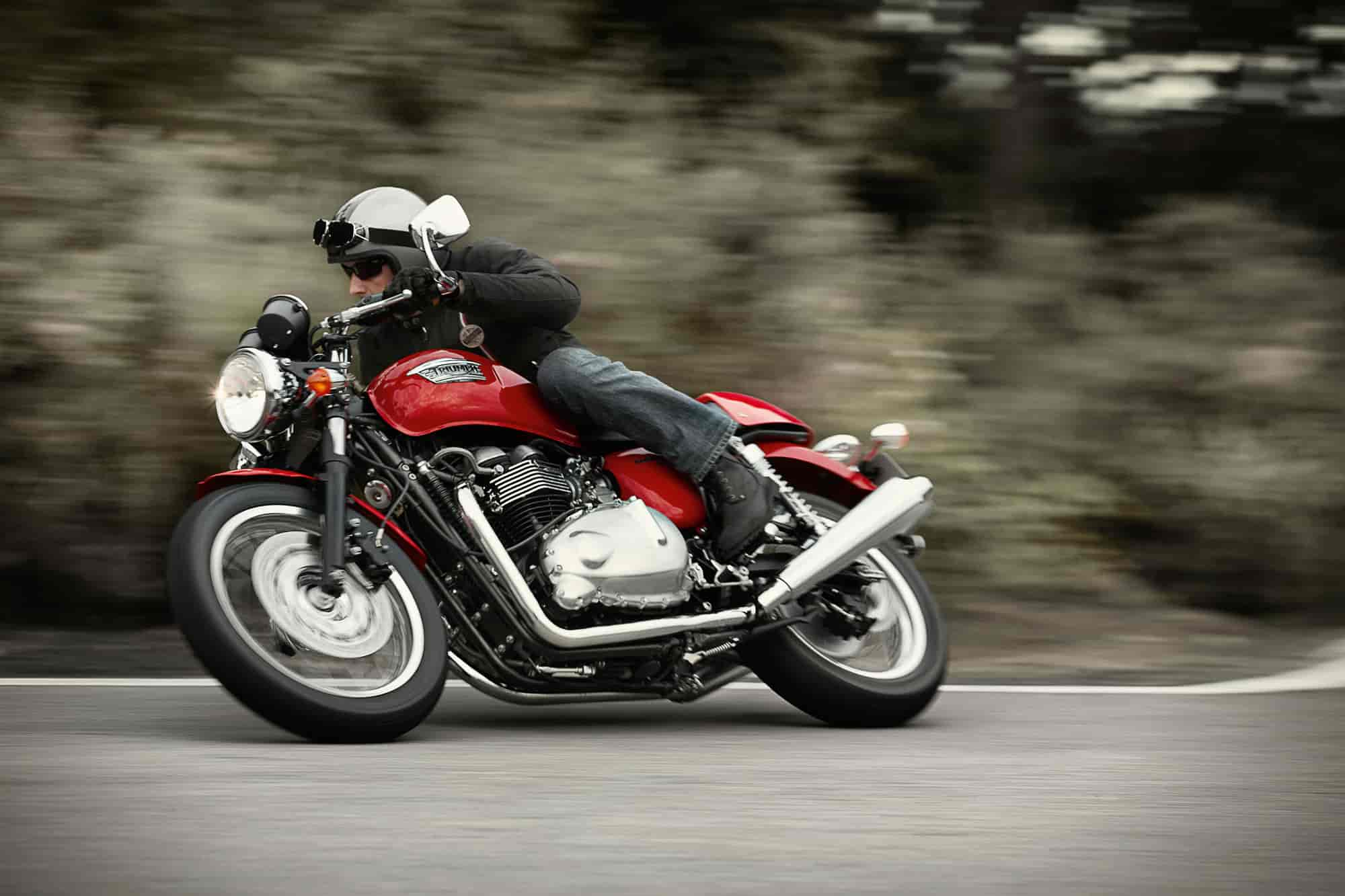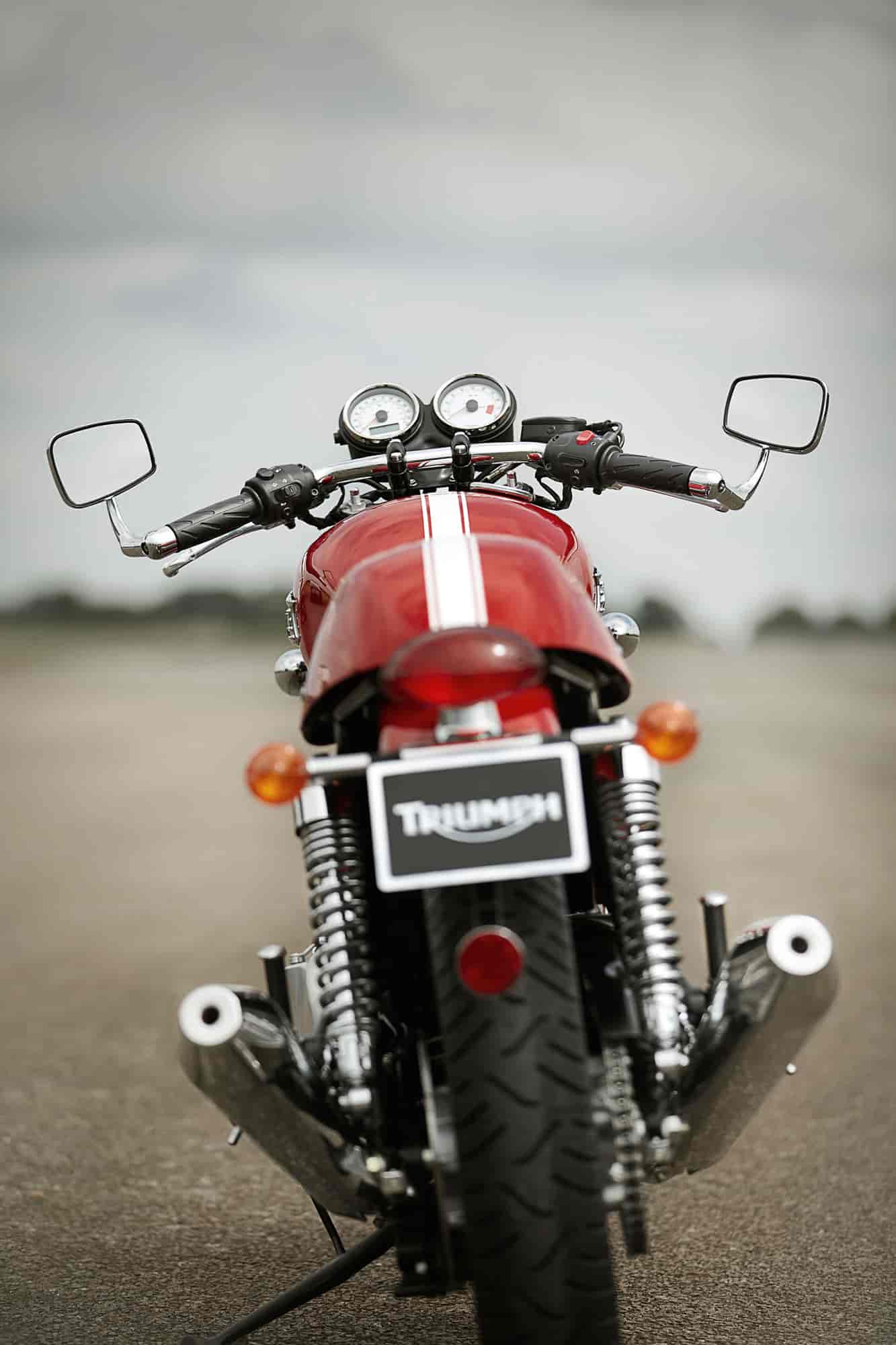 Inspired by the 60s café racer. Named after the triumph racing bikes of the era. The real deal. Remastered from the original. A sporty yet comfortable riding position. Fuel injected 865CC parallel twin tuned for performance. Spoked wheels. Megaphone style pipes. 18 inch front wheel with aluminum rim. Floating front disc and two piston caliper with braided hoses. Analog tachometer for perfectly tuned gear changes. Triumph’s sportiest modern classic. Thruxton roars back. It’s ablast!