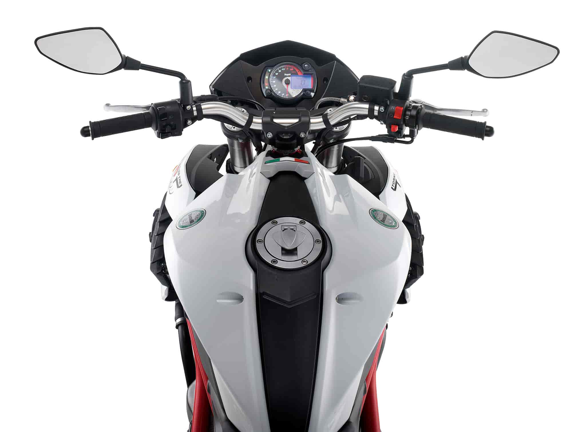 The TNT 899 stands out for its sporty elegance and slender lines, for the white colour combined with the flame-red frame and the many racing details.