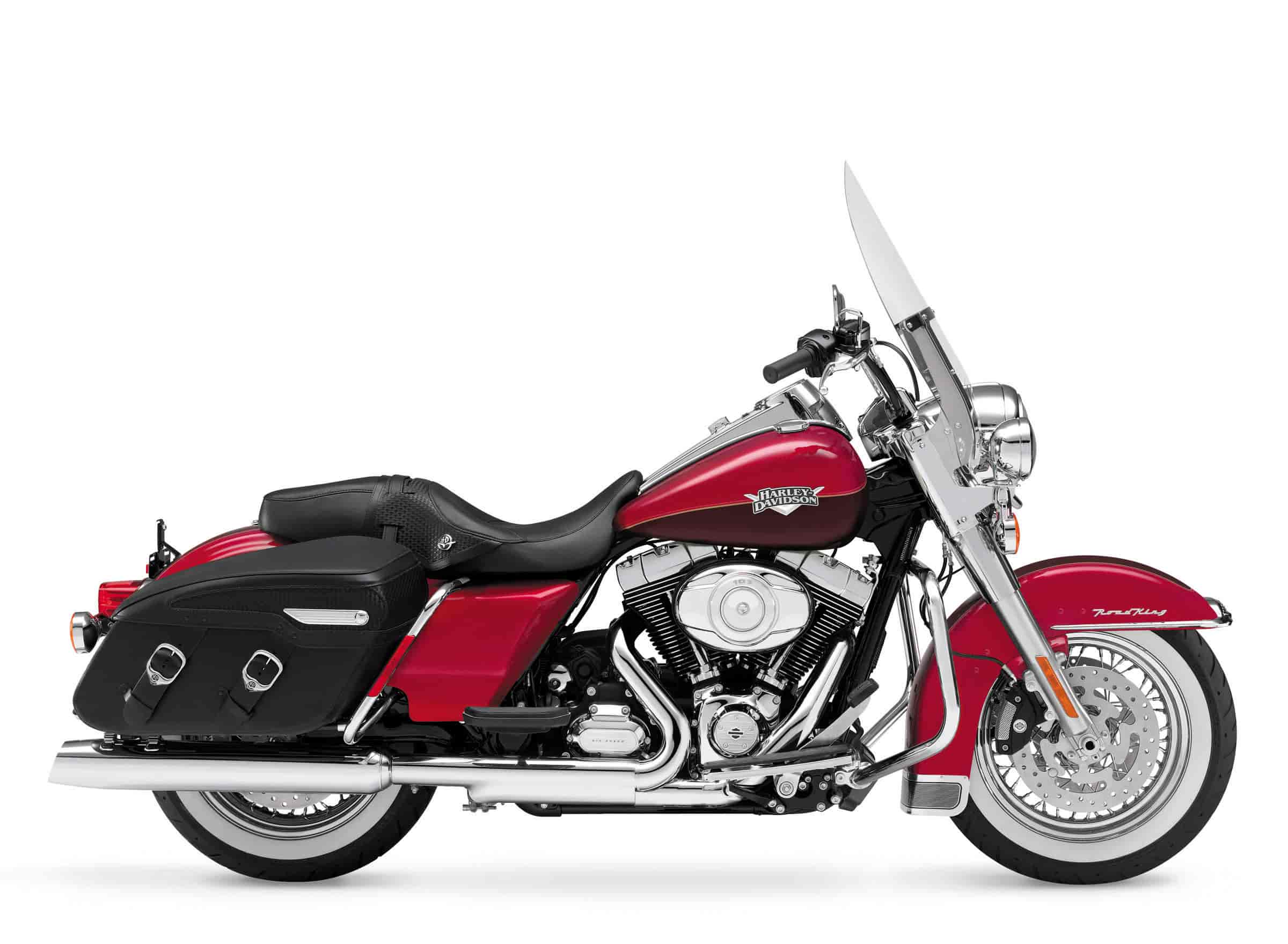 The Road King® Classic model takes the nostalgic look and feel of the Road King a little further with extra details for this road-worthy touring bike, like leather-wrapped saddlebags, nostalgic chrome fuel tank console, tooled metal detailing on the fender, tank, seat and bags, and chrome laced wheels with wide whitewall tires.