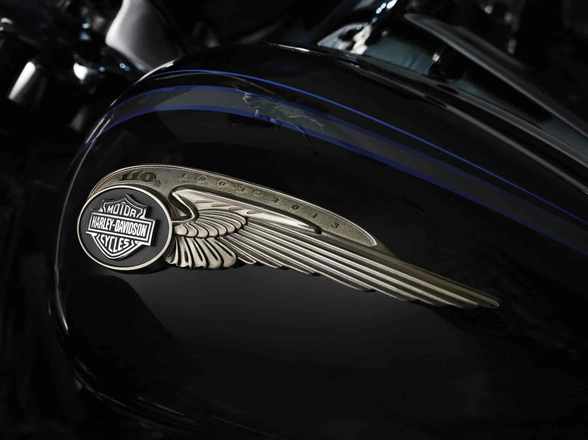 A highlight of each 110th Anniversary Edition model are solid bronze fuel tank badges, plated in black nickel and then distressed to highlight the bronze. A bright gold-tone Bar and Shield cloisonné is inserted in the main body of the “single wing” badge while each motorcycle will carry other model-specific anniversary badging, trim and a serialization badge.