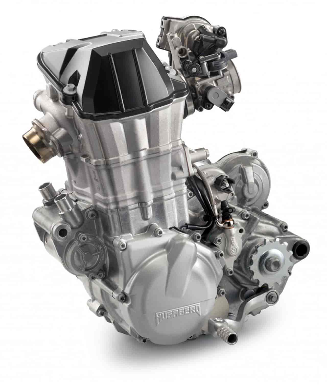 The engine cases for the new 450/501 engine generation are manufactured – as they are on the FE 350 – using a high-pressure die casting process, resulting in significantly reduced wall thicknesses but with the same stability. Thus, together with the weight savings on the piston, connecting rod and balancer shaft, the weight of the engine could be reduced by a whole 2 kg. Due to this significant reduction in the rotating masses, the handling advantage of the previous 70° engine layout was able to be more than compensated for, and a conventional engine layout once again used, which also provides the following additional advantages: