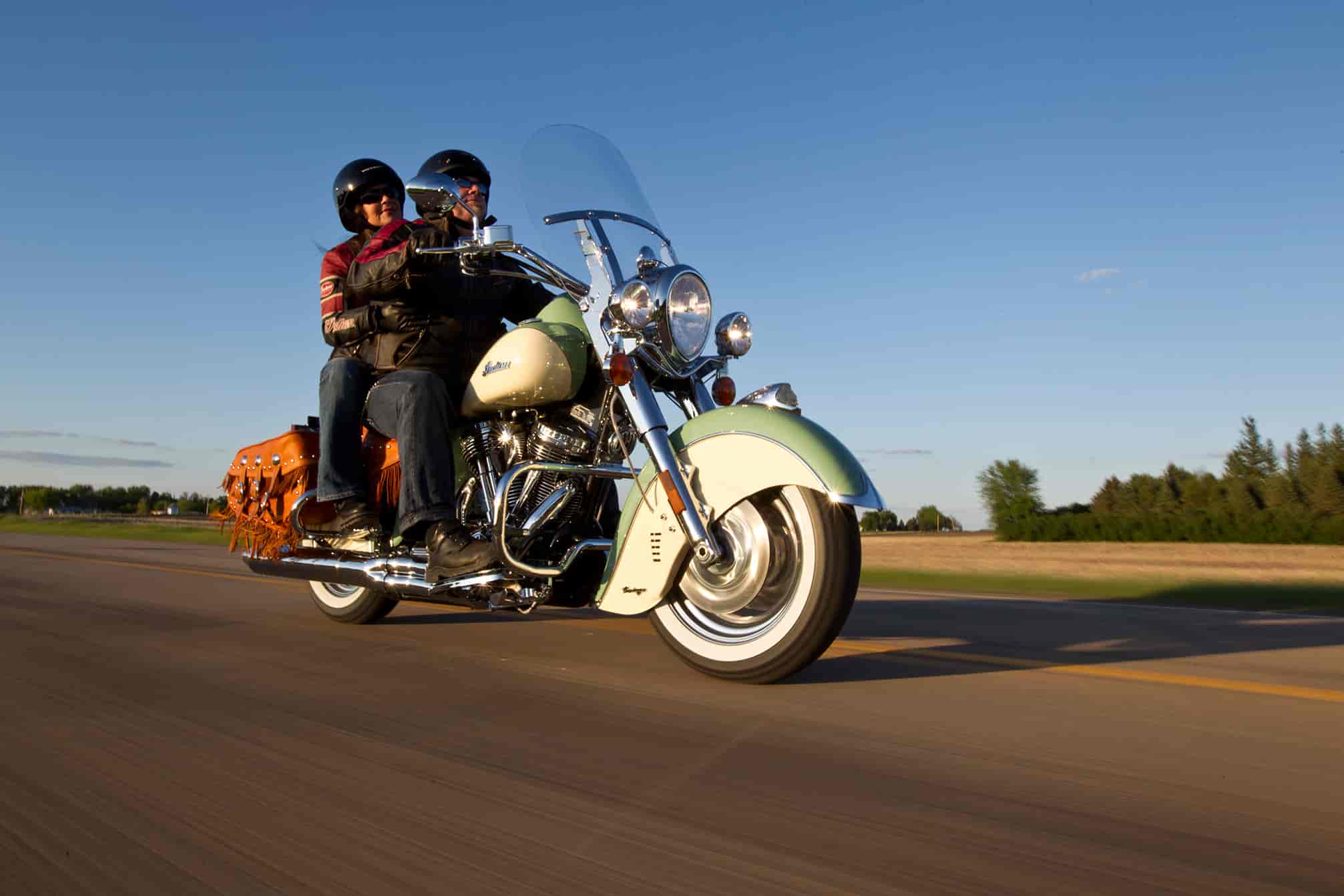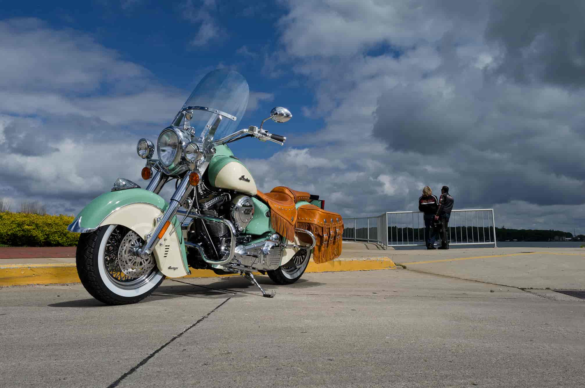 PowerPlus 105ci engine. Distressed tan leather with fringe covering the seat and saddlebags. Stunning two-tone paint scheme and classic whitewall tires. Get on one. See where the road takes you.
