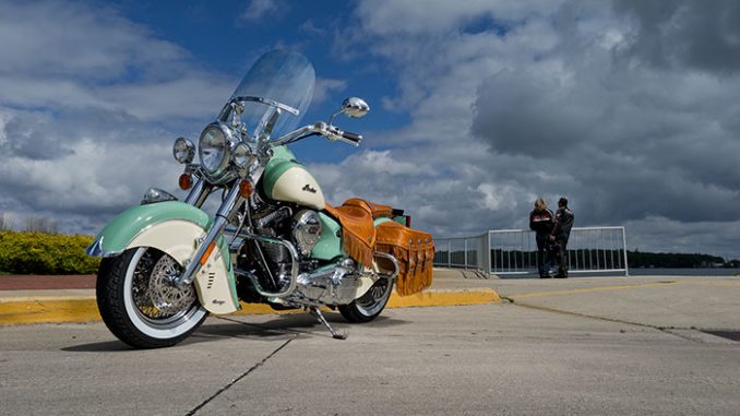 Chromed Indian Script tank design and two-tone paint scheme give the bike a look of yesteryear.