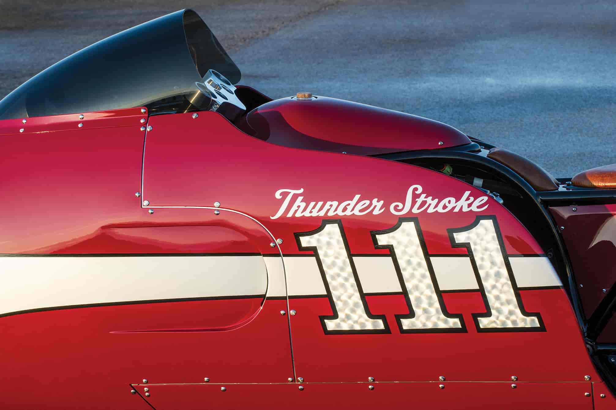 The streamliner was designed from the ground up to house the new Thunder Stroke 111 engine and showcases its awe-inspiring power and performance. The Spirit of Munro is not simply a display; it was built to run. A custom exhaust and intake system is mated with a chain drive conversion to allow for the tall gearing necessary for top speed runs. The all-aluminum bodywork was hand-formed using traditional tools and techniques. Wrapped around the modern Thunder Stroke 111 engine is a custom chassis capable of handling top speeds.