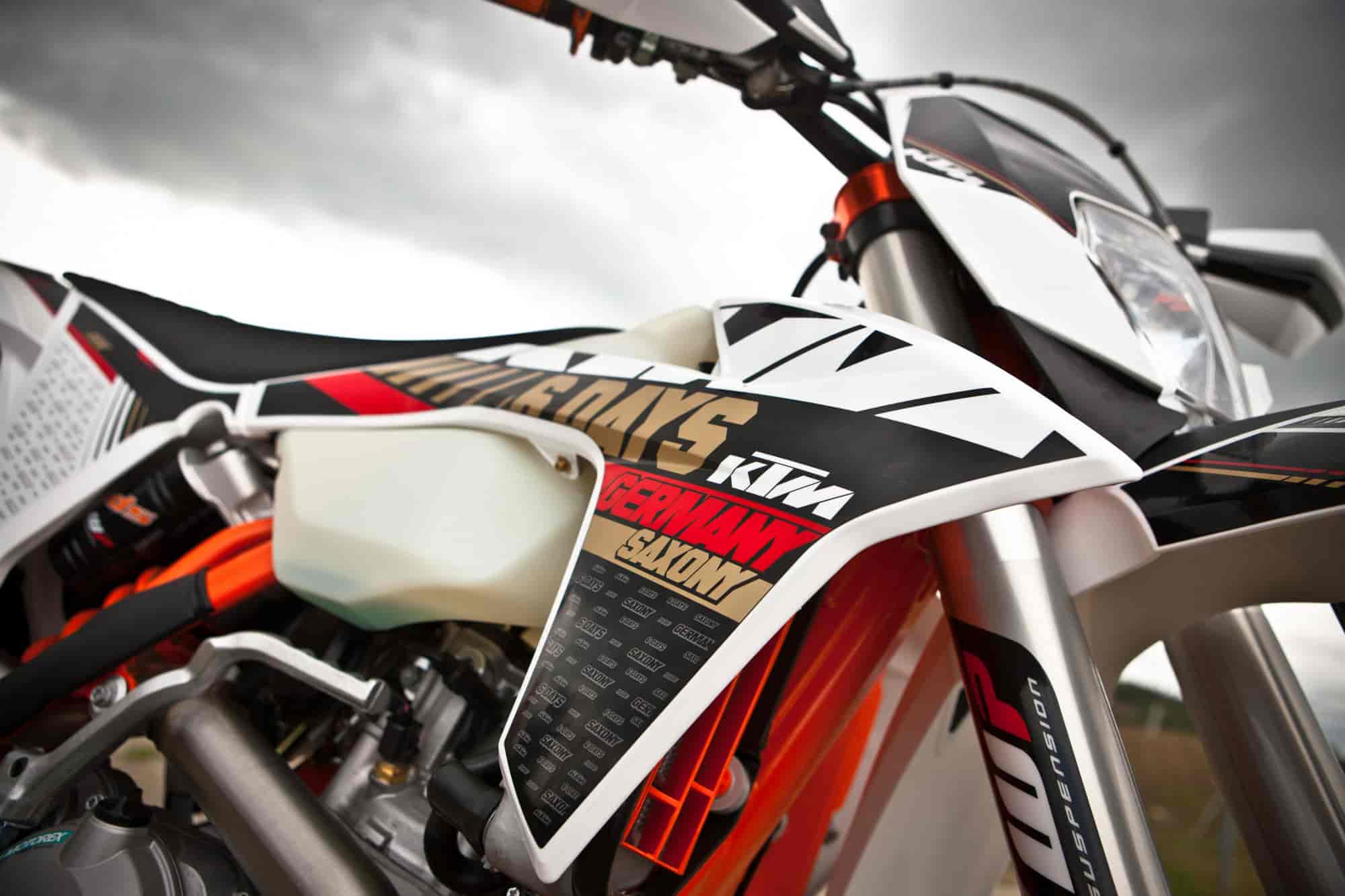The KTM 125 EXC Six Days has bodywork with extremely slim ergonomics and excellent contact points between rider and machine. It provides unlimited freedom of movement. For MY 2013, the bike stands out with newly styled graphics in the colours of the ISDE in Germany.