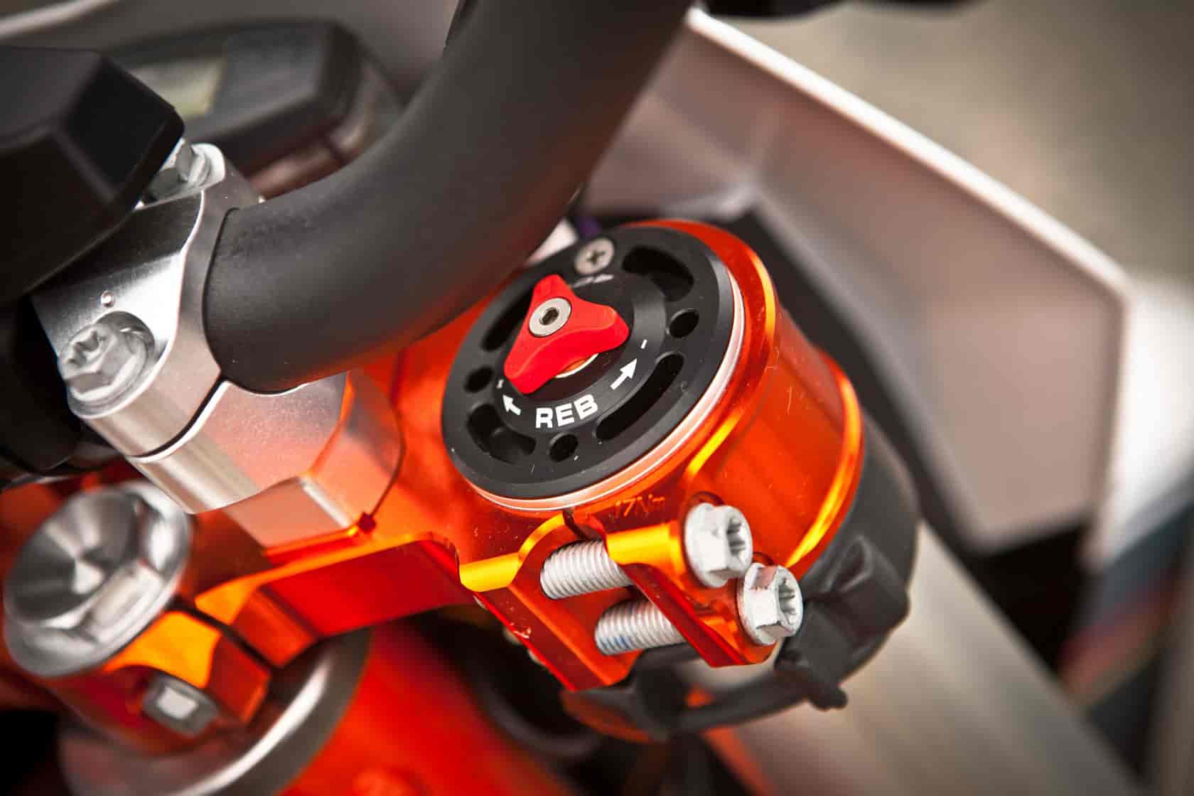 The Six Days models are equipped with a completely redesigned, 48 mm closed-cartridge fork from WP Suspension. The new 4-chamber technology (4CS) patented by WP not only provides a key benefit in terms of responsiveness and consistent damping characteristics, it is also lighter and oil services prove to be far simpler than on the conventional closed-cartridge versions. This fork overcomes extremely rutted tracks and other such major obstacles with the greatest of ease. Another benefit: The fork can be adapted to track and rider in a matter of clicks at the top of the fork: compression damping on the left-hand shaft, rebound damping on the right.