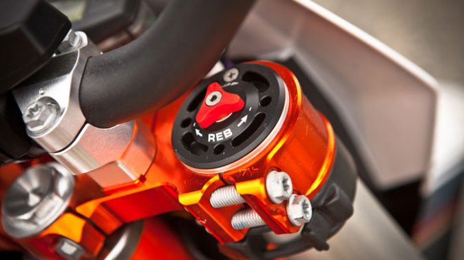 Each EXC model has its own individual suspension settings in 2013, optimally tuned to weight and engine. At the rear, a PDS shock absorber from WP Suspension works with a direct linkage to the upper side of the swingarm. The wide range of setting options for rebound damping and high- and low-speed compression damping are standard on KTM bikes.
