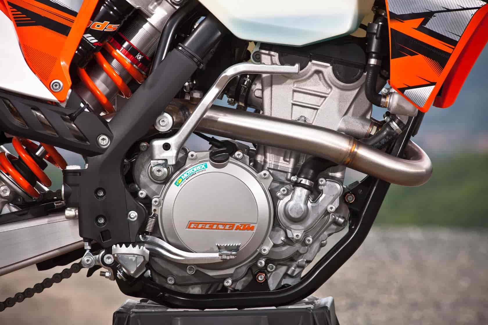 The dimensions and weight of the KTM 350cc engine are virtually the same as the 250! Its superlative performance results from reducing the moving masses to a minimum. The 350 EXC-F utilizes the highest technology available for maximum performance in a street-legal package!