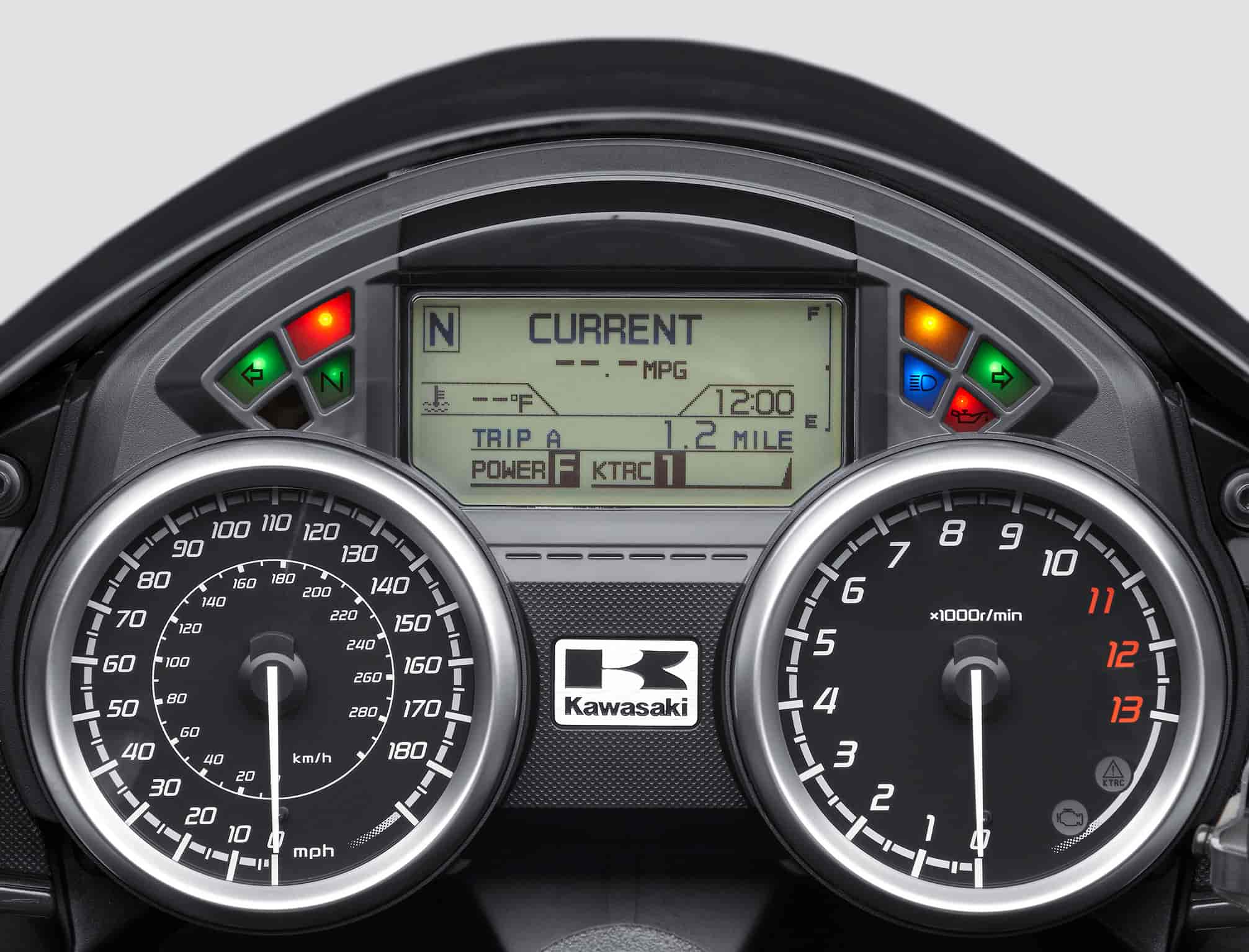Beyond just being impressively strong, the engine’s manners are also effectively managed by a combination of its back-torque limiting “slipper” clutch assembly, a three-mode KTRC traction control system and a two-mode Hi/Low power selector system. The first two KTRC modes are intended to maximize acceleration similar to the ZX-10R’s S-KTRC, the third mode is tuned for low-traction (wet/slippery) conditions, similar to the Concours 14’s KTRC. The KTRC system can be turned-off by the rider and its settings and the Hi/Low ignition maps can be selected with the bar-mounted toggle/push switch. KTRC activity can be monitored on a seven-segment real-time bar graph in the cockpit’s LCD info-screen. The back-torque limiting clutch technology comes directly from the racetrack, and helps eliminate the wheel-hop and stability-eroding torque effects of energetic downshifting and braking while cornering, or during spirited – or emergency – stops. It also helps protect the bike’s drive train, for optimum durability.
