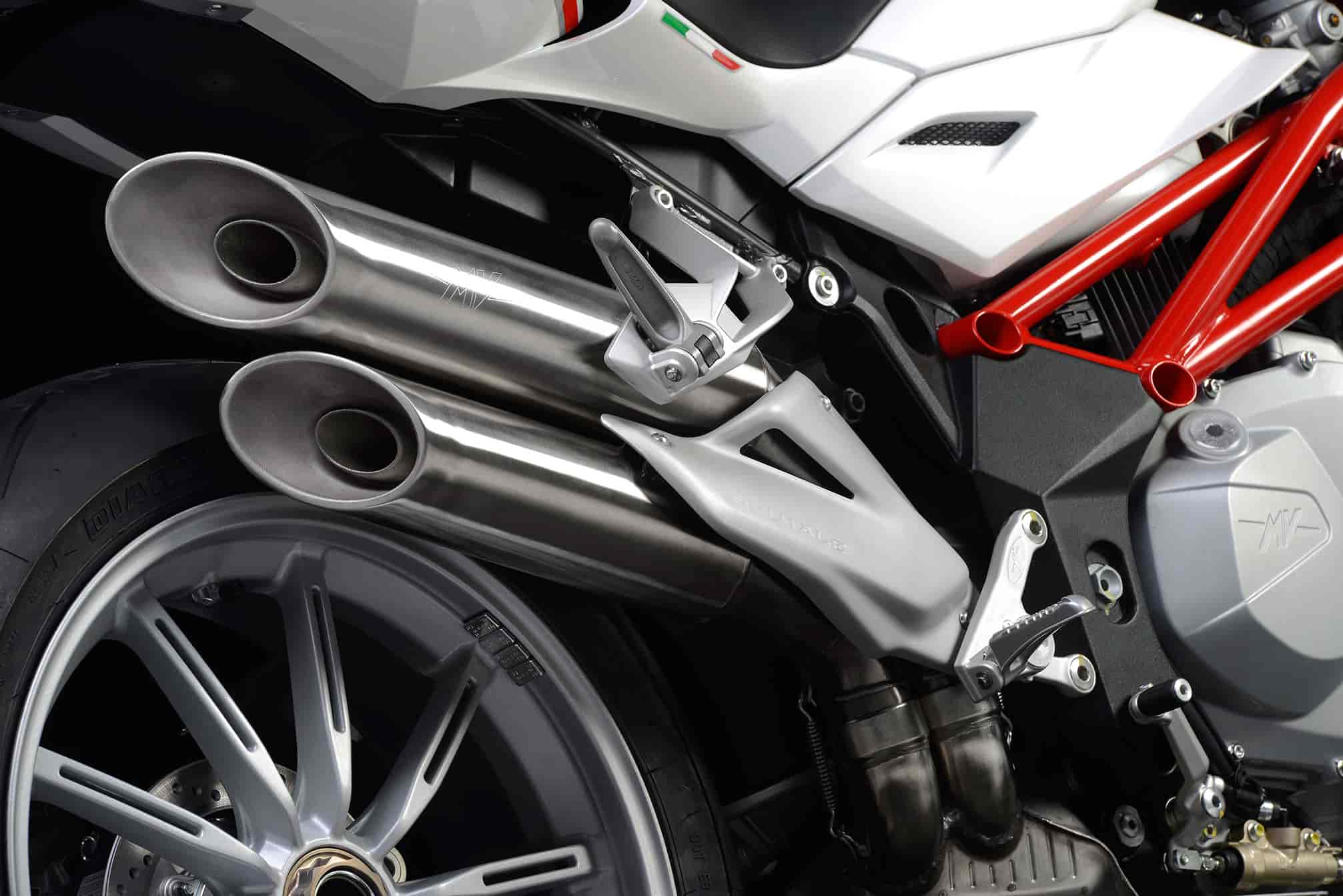 Form and function: following these inspirational principles Brutale continues to fascinate and has evolved in many details. Having immediate impact are the lighting elements, day running lights, arranged symmetrically on either side of the dashboard cover: capable of enhancing the whole frontal section, also making the motorcycle more visible and therefore safe during day and night. Another ray of light comes from the four-cylinder engine, now silver, a color that emphasizes its compactness and accurate implementation of all its elements. The same chromatic range characterizes the new wheels, a unique design in the motorcycle industry: the multiple spokes are split and give rise to a fascinating design and at the same time efficient, considering the weight of a pair of wheels has been decreased by about 1.500 grams compared to those fitted on previous models. The two new double exhaust silencers, a key element of the design, have become even more racing thanks to tapered ends, with a decisive diagonal cut reminiscent of American dragsters. The surface finish enhances its compact size; the new aluminum plate that prevents contact with the pipes has been redefined.