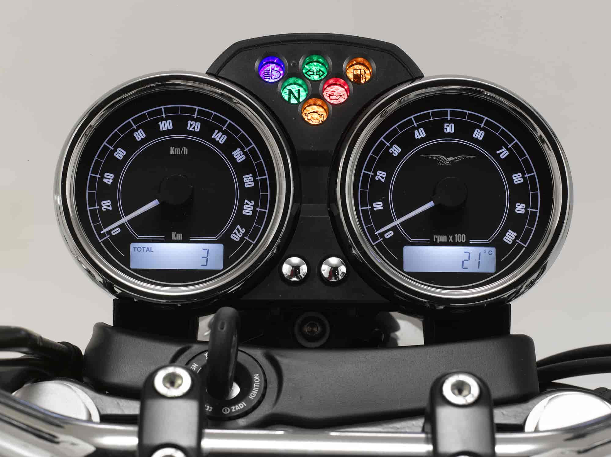 The charm of the V7 Classic is also expressed by the bright chrome work, such as on the exhaust pipes, the shock absorbers, the rear light, the fuel cap, the front light, the comfortable handlebars and the frame of the speedometer and rev counter.