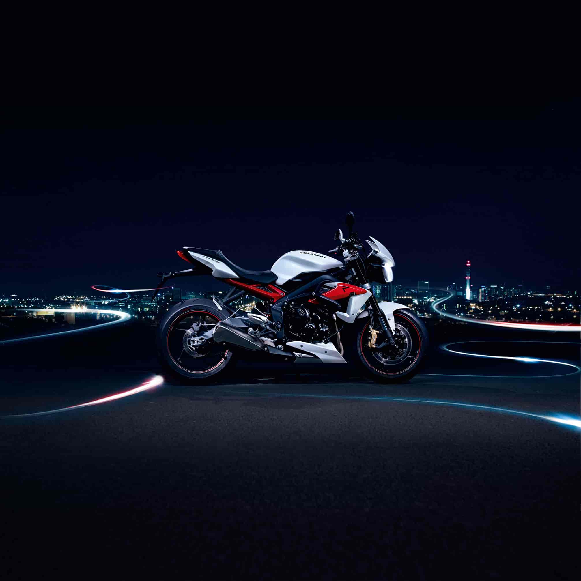 With hard-edged street looks, exposed engine, unmistakable twin headlamps and low-mounted silencer this is a pure riders bike. A striking new wheel design reduces un-sprung mass which improves dynamics and agility. And for an even sportier edge, the Street Triple R comes with a red rear sub frame, red side radiator cowls, and red pinstripe detailed wheels.
