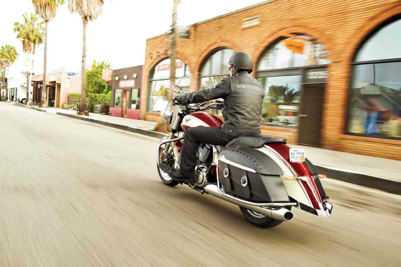 Subtle and stylish, the Cross Roads Classic features contrasting white stitching on the black leather seat and saddlebags for classic vintage style. These styling cues tie the elements of the bike together for a innovative and throwback look.