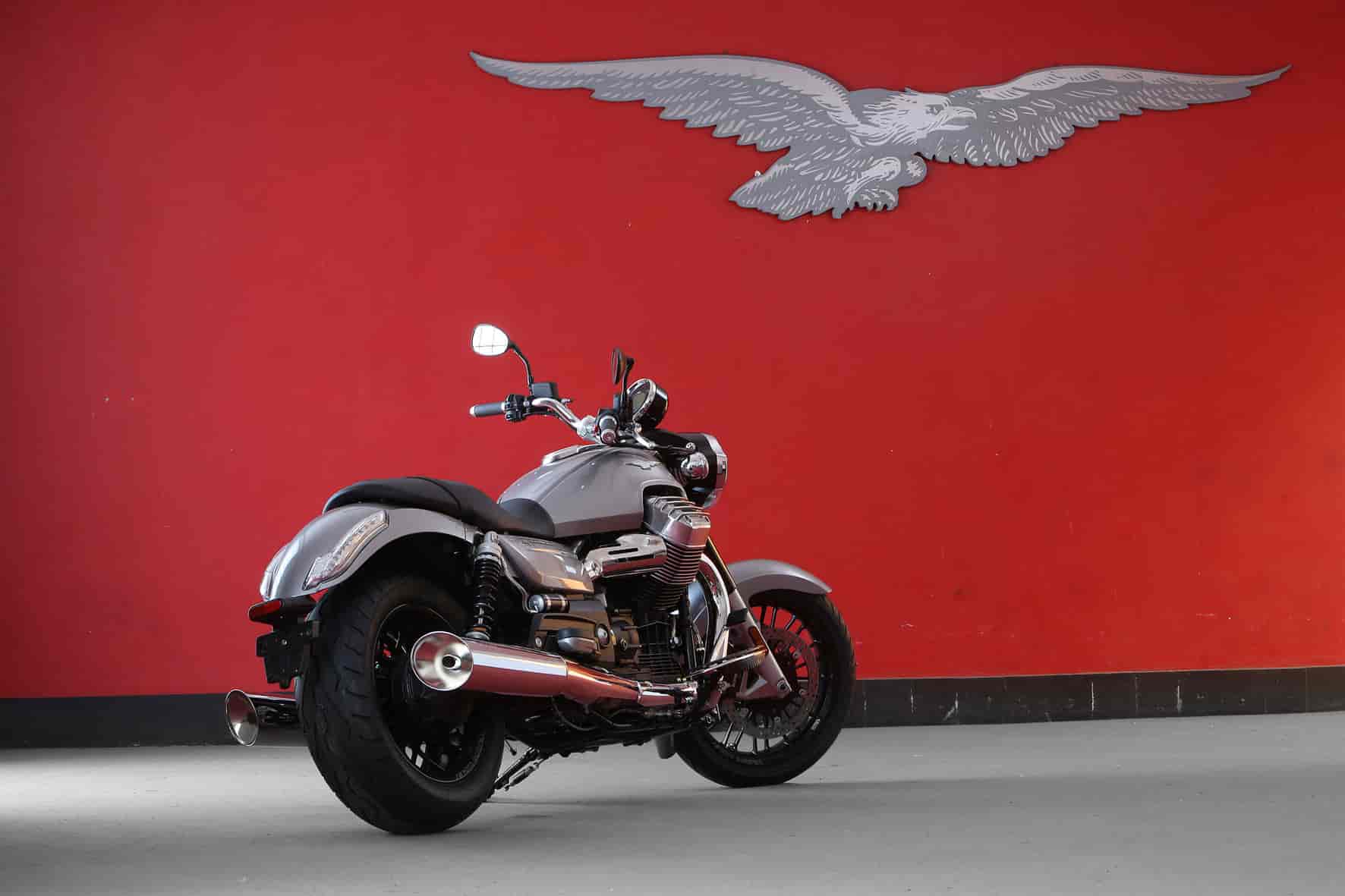 It conquers the rider with the strength expressed by its unique cruiser design, hard and pure: two wheels, an engine, saddle and handlebars. All made with the rigour of form and function, combined with a typically Italian aesthetic sense, expression of attention to detail and execution ability worthy of the best interpretations Made in Italy has ever produced in the automotive field. This can be seen in the details, such as the two-seater saddle boasting the hot-pressed Eagle logo, the drag bar handlebars with light-weight supports and the original rear shock absorbers with external tank. To increase the expressive power of the design is also the minimal graphics based on textured colours such as mercury grey and basalt black and certain skilful touches of style, such as the black lacquered wheels with red Moto Guzzi logo and black wing mirrors.