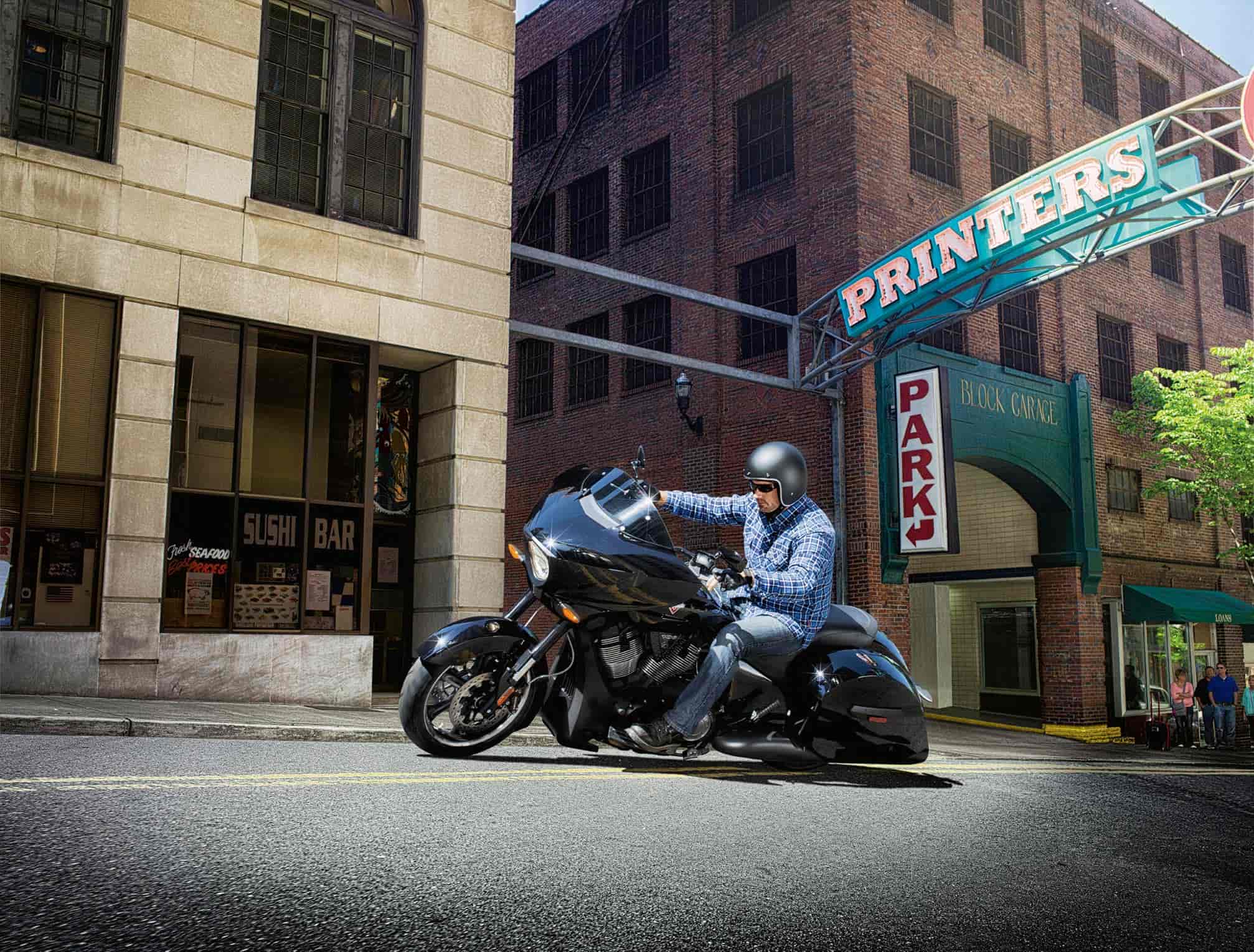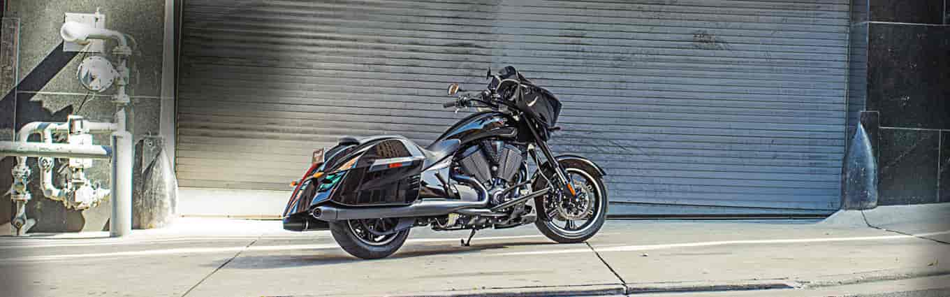 A stylish blacked-out Victory bagger with a fairing, audio and convenient cargo space…